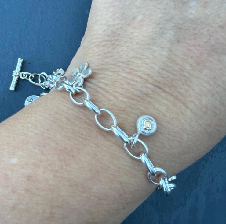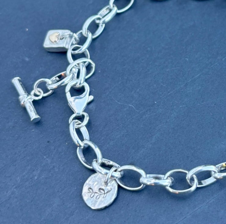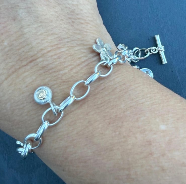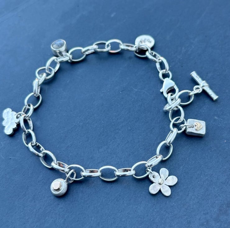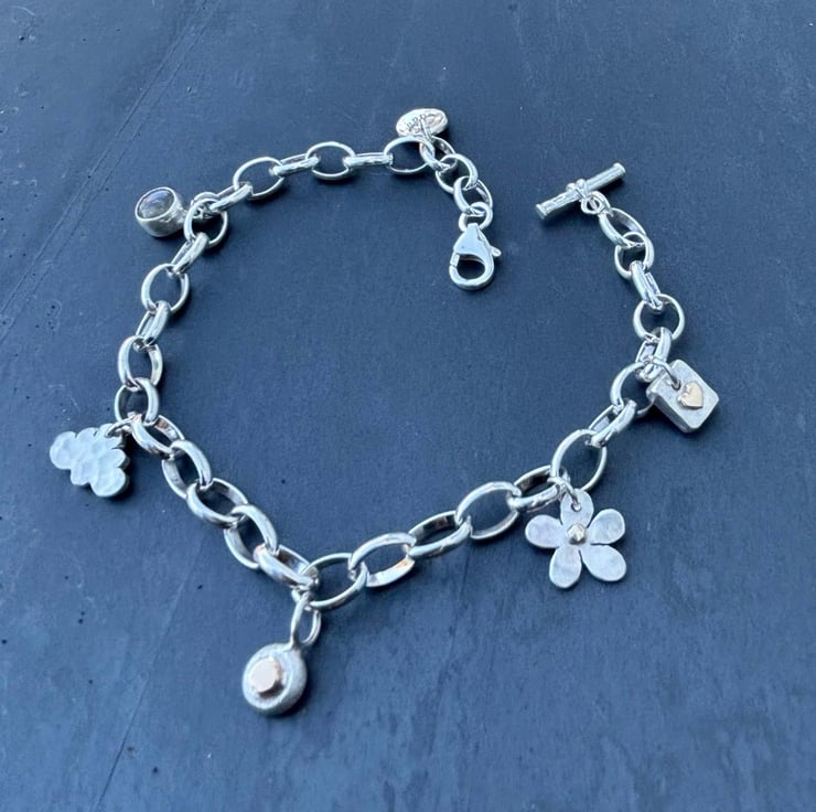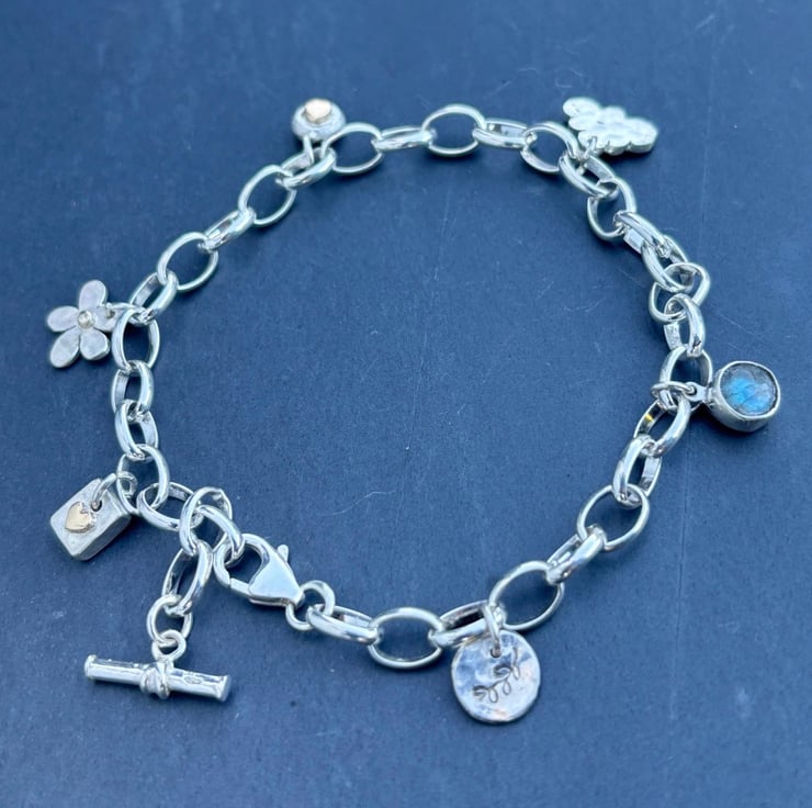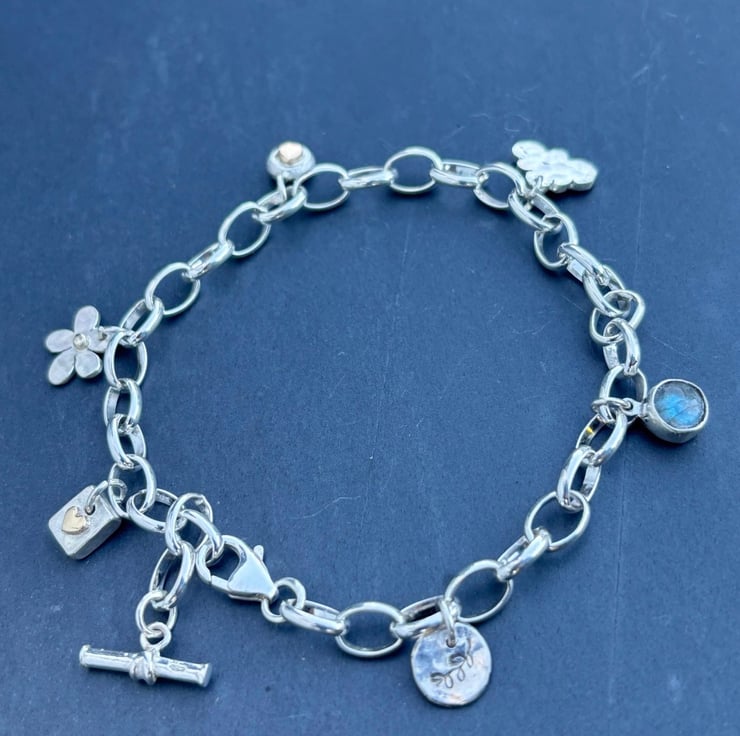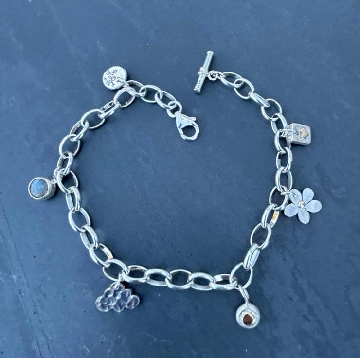 This Silver Charm Bracelet is made from Sterling Silver and solid 9ct gold. It is adjustable and has a total length of 8” but if you need a different length please let me know at checkout. There are 6 charms on the bracelet: daisy, labradorite, gold heart on silver, silver pebble with gold ‘penny’ silver hammered cloud, and leaf stamped circle but room for plenty more. On the ends are a t bar and trigger clasp which attaches to any link.