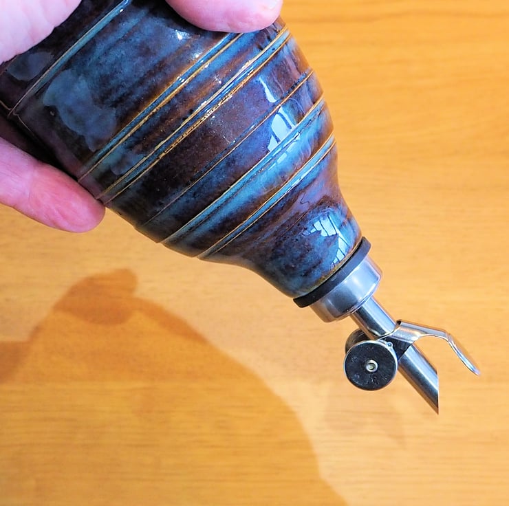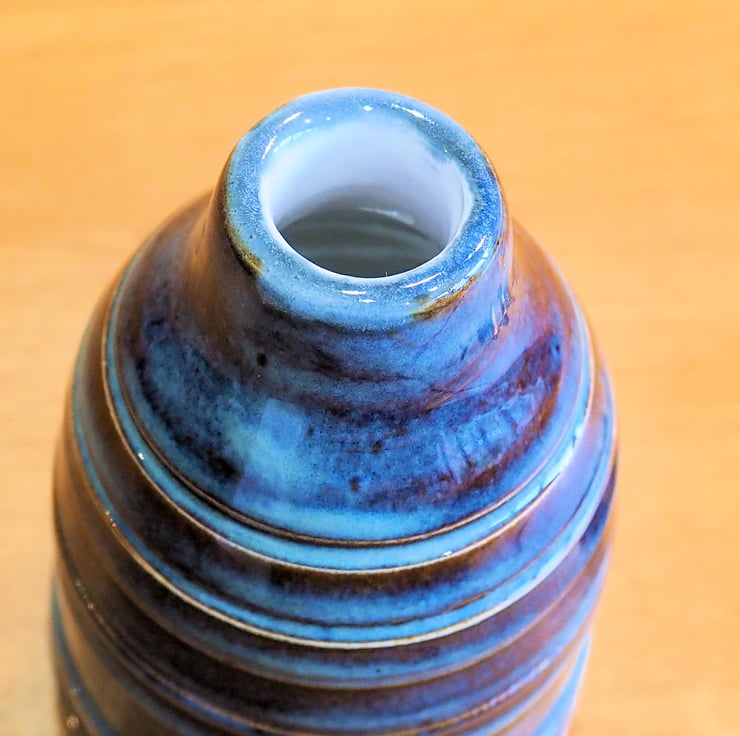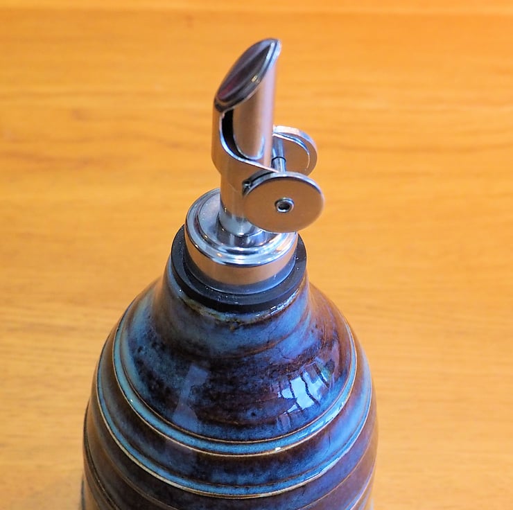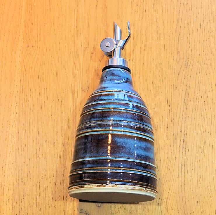 Ceramic olive oil or vinegar bottle with stainless steel drizzler included. Made on my pottery wheel from stoneware clay. Finished in a multi-tone blue glaze with white glaze inside. Could also be used as a scent diffuser.