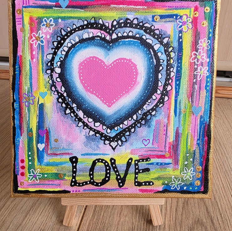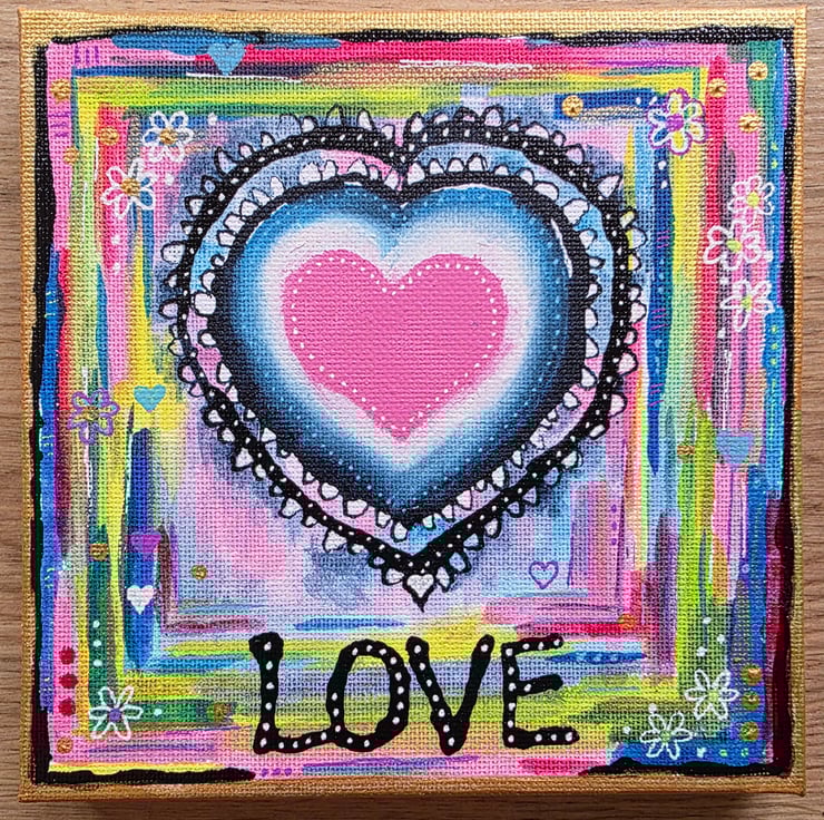 'Love is all around' is a small mini-canvas created in acrylic ink by Elaine Curtis, featuring a cheerful group of abstract flowers.