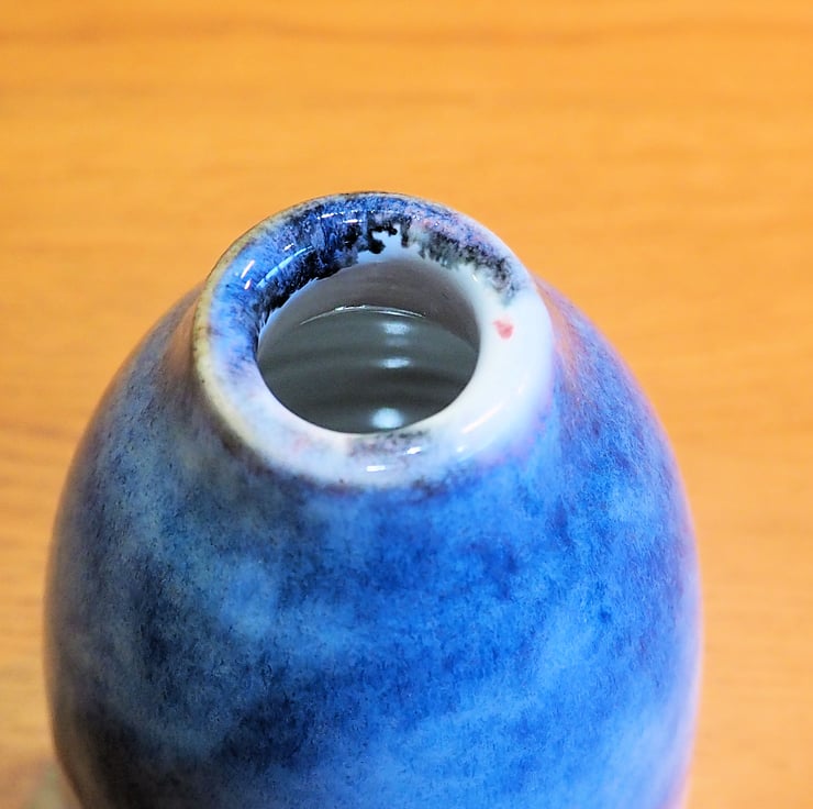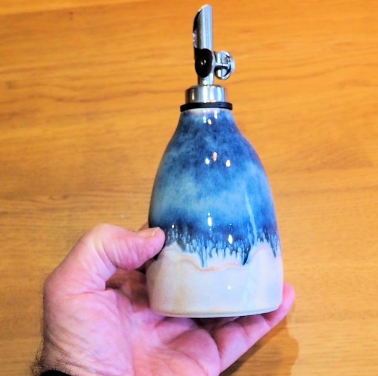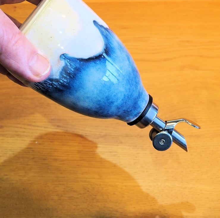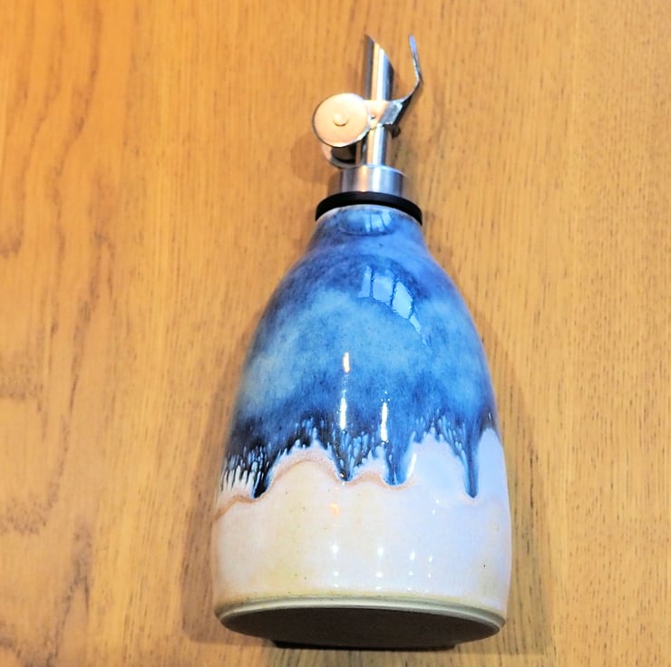 Ceramic olive oil or vinegar bottle with stainless steel drizzler included. Made on my pottery wheel from stoneware clay. Finished in a multi-tone blue and cream glaze with white glaze inside. Could also be used as a scent diffuser.