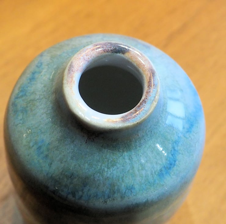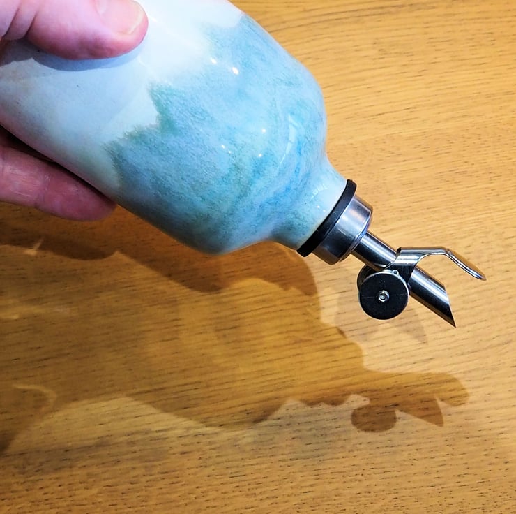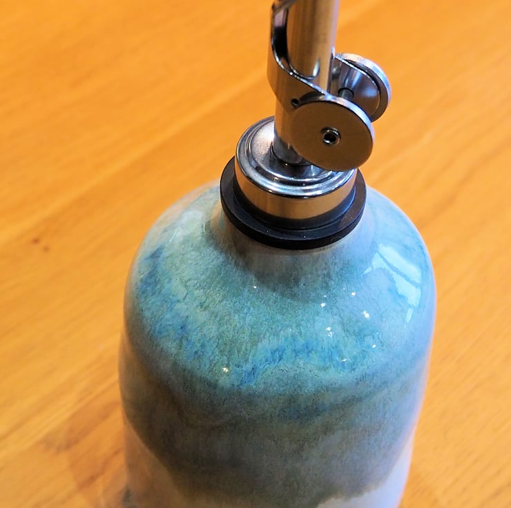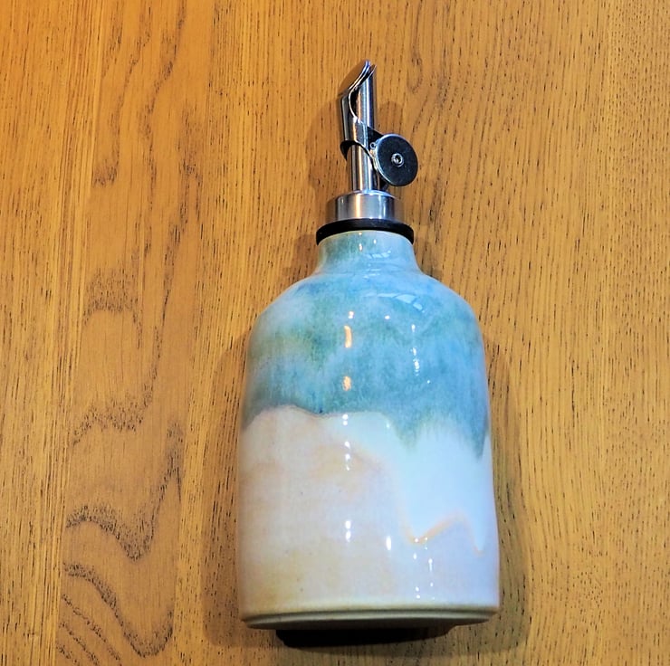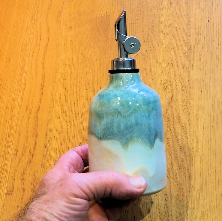 Ceramic olive oil or vinegar bottle with stainless steel drizzler included. Made on my pottery wheel from stoneware clay. Finished in a multi-tone green, turquoise and cream glaze with white glaze inside. Could also be used as a scent diffuser.