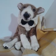 Knitted in a wool yarn with his tummy and neck ruff in a faux fur making this cuddly puppy very huggable.