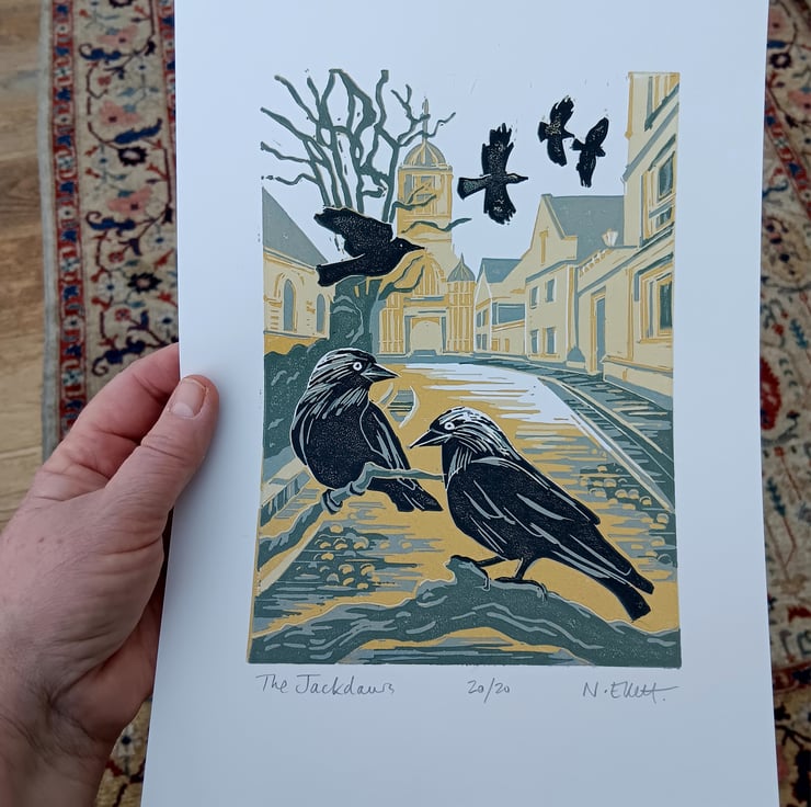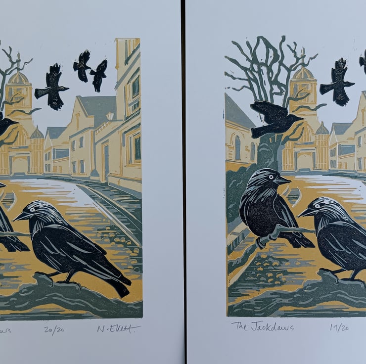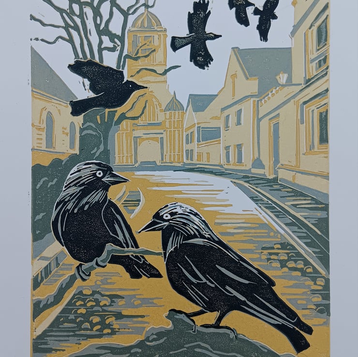 Inspired by walks through the streets of Oxford and the chattering and antics of Jackdaws. We have families of them in our garden noisily demanding attention. I have printed them with Christchurch College entrance gate (Tom Tower) in the background. Jackdaws mate for life and are very intelligent.