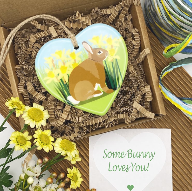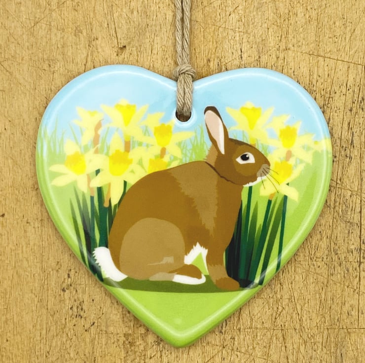 Hanging Heart Decoration with a Spring Bunny sitting in the Yellow Daffodils makes a cute and quirky Valentine’s gift - a bright and colourful Easter gift, or decorative Spring ornament.