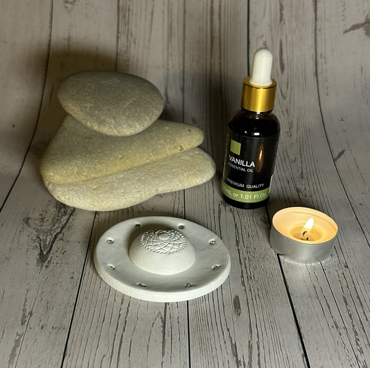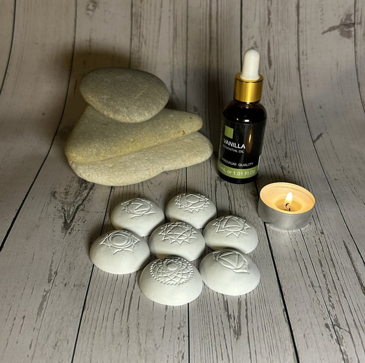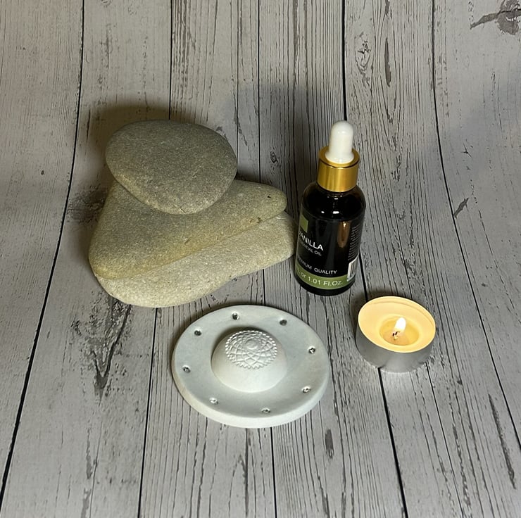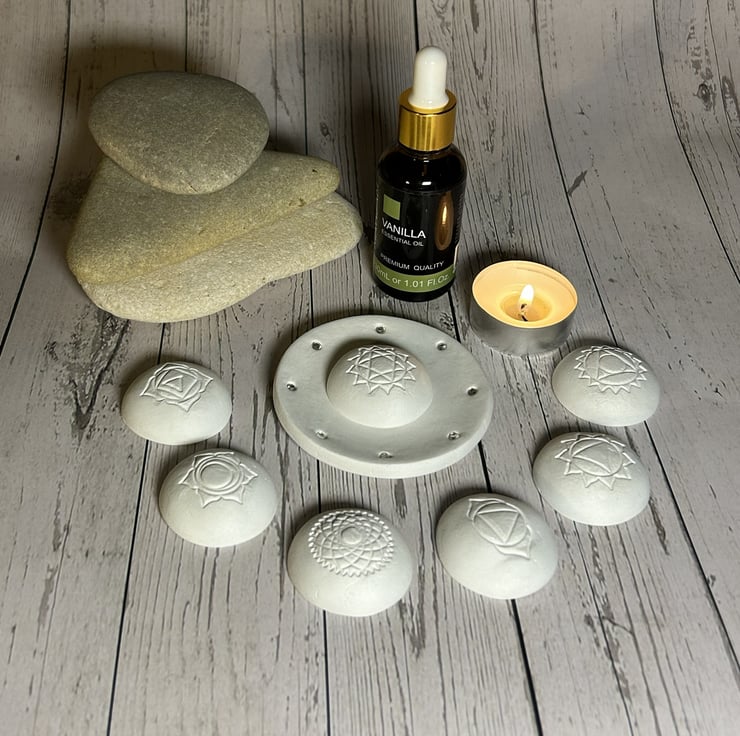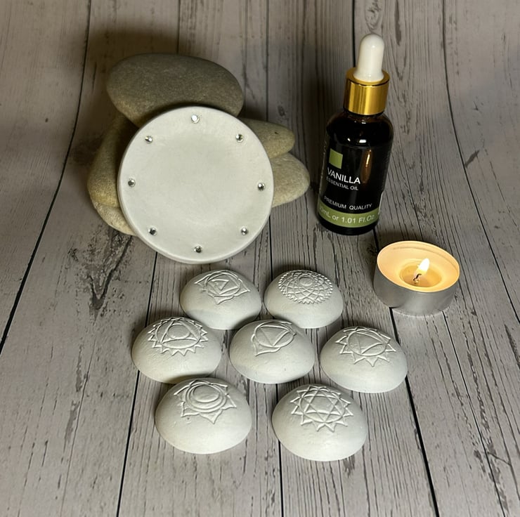 To complement my natural clay diffuser range, I wanted to bring more of my spiritual and wellbeing focus into my work. I created a set of handmade clay chakra stones and a simple, tactile clay dish so you can choose a different stone each day or whenever you want to invite a particular energy into your space.