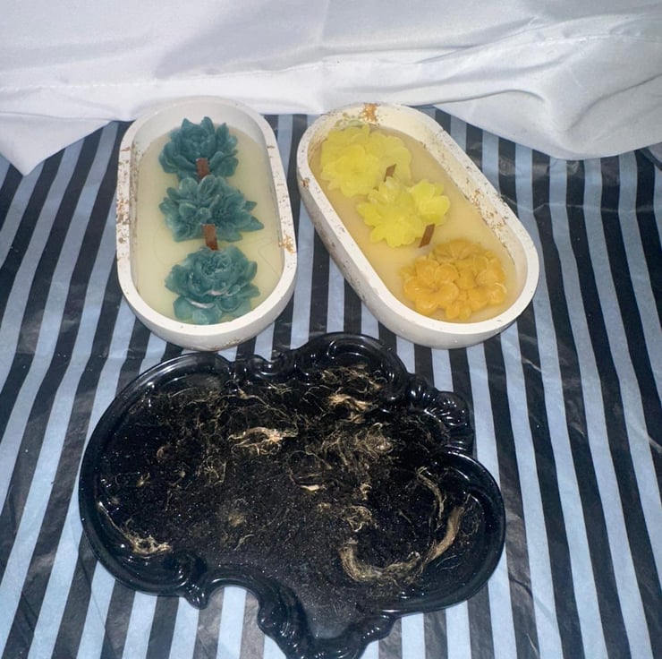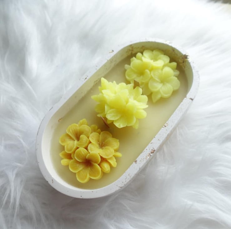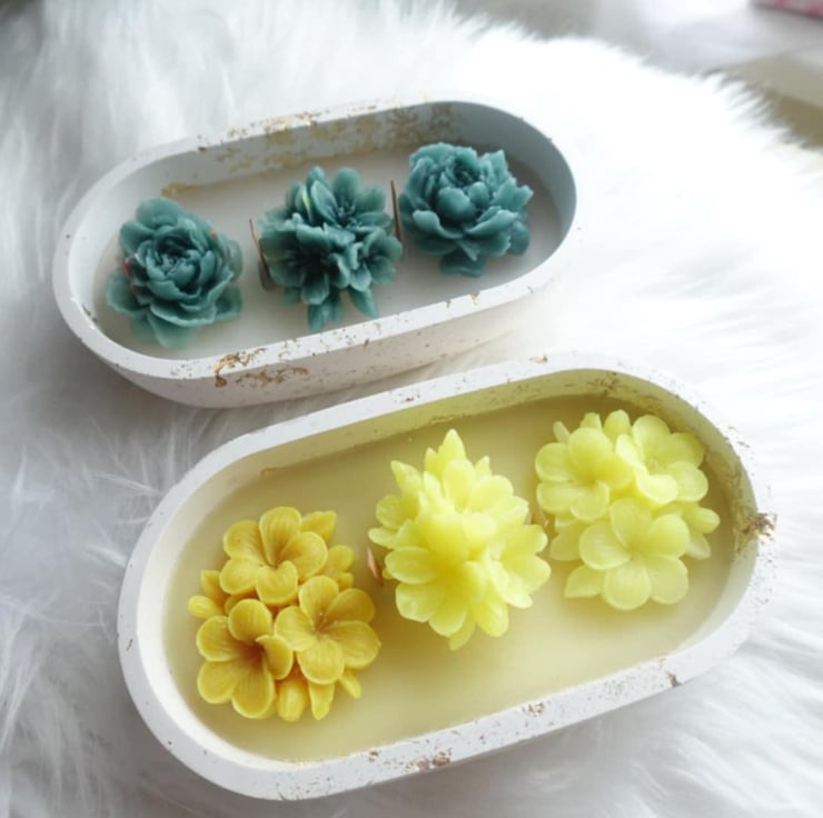 Refined candle set featuring two flower-shaped candles and one elegant tray.