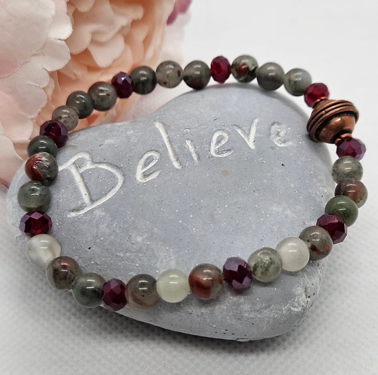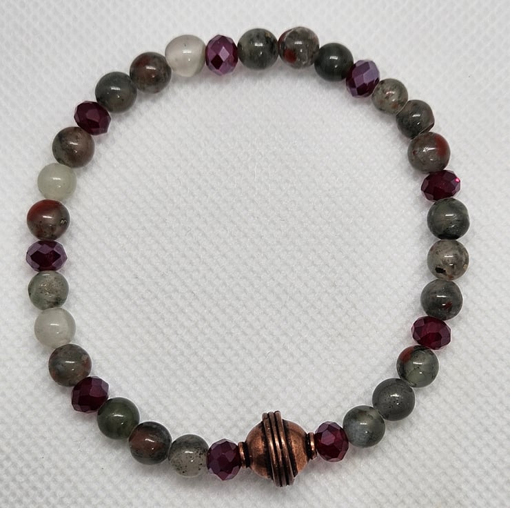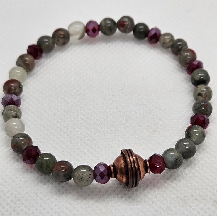 Bloodstone gemstones with wine red Czech crystals and an antiqued copper focal bead on jewellers grade elastic. These warm, earthy tones really work well together. A lovely dainty bracelet that can be worn at all times. This measures 6.5" before stretched. The bracelet will be gifted in a burlap or hessian drawstring bag.