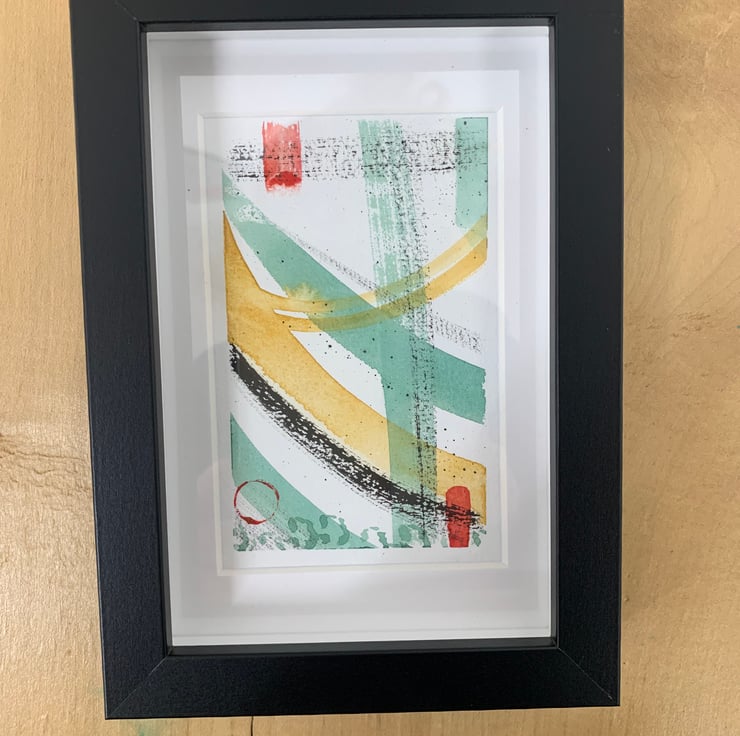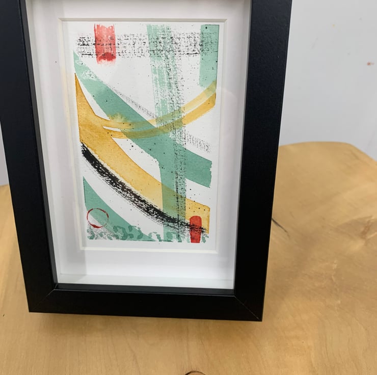 This original abstract painting is presented ready framed in a 10cm x15cm frame and mounted inside a rectangular aperture. It is suitable for directly hanging on a wall, or standing on a shelf.