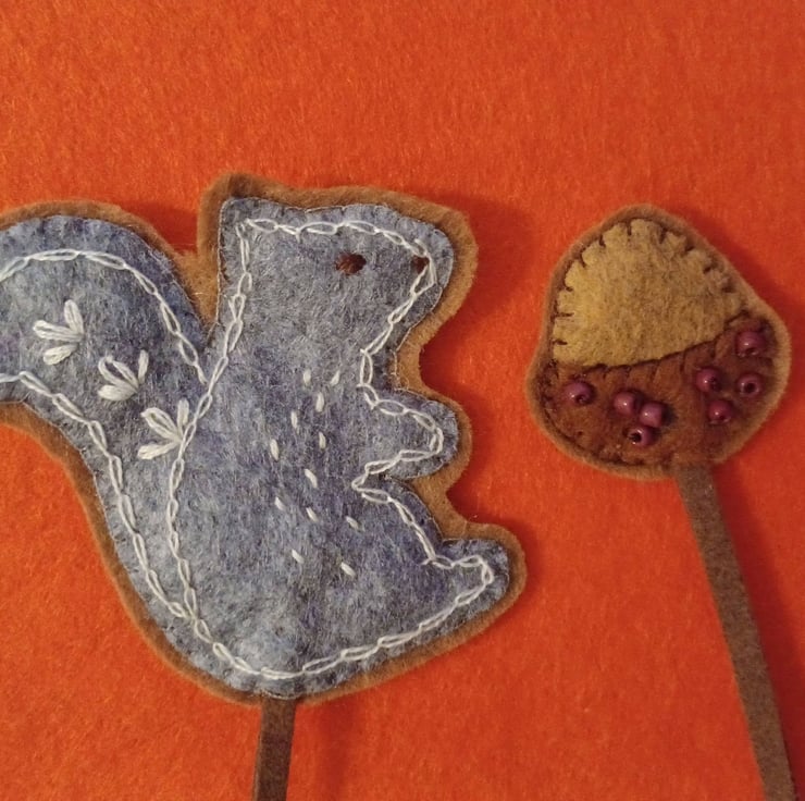 A fun and whimsical bookmark using my own pattern, for anyone who loves squirrels. Made from soft wool felt and a leather/suede cord, these are very lightly padded, which makes them tactile to hold while reading.