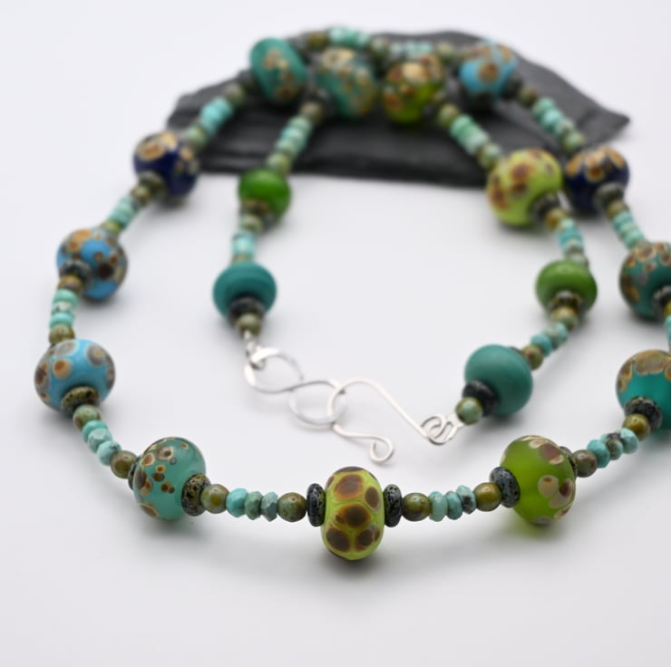 A beaded necklace made with handmade lampwork glass beads and Turquoise gemstone beads.