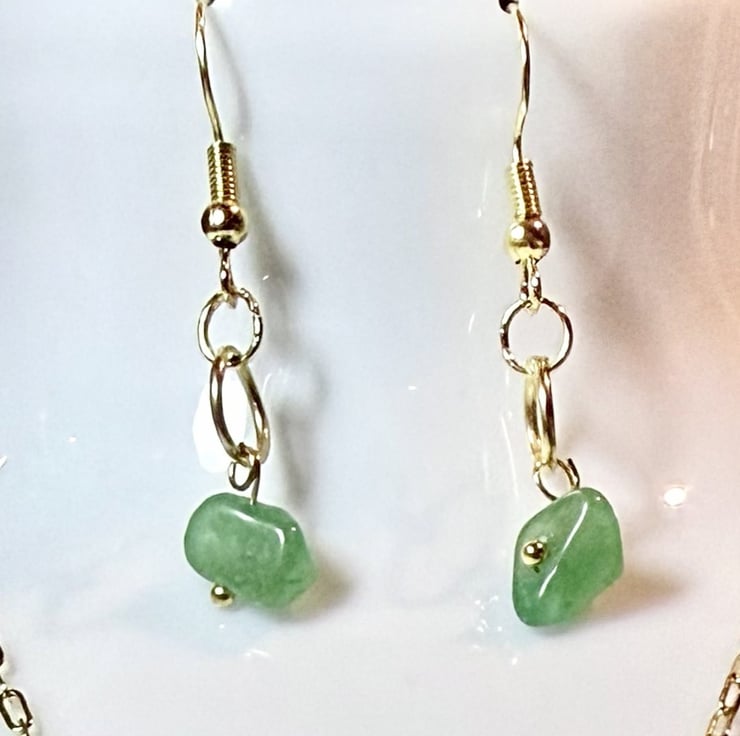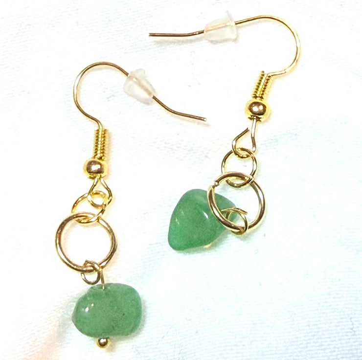 Made with natural green crystal stone nuggets with 14 Karat gold. These hooked dangle earrings come with behind-the-ear silicone backing.