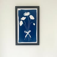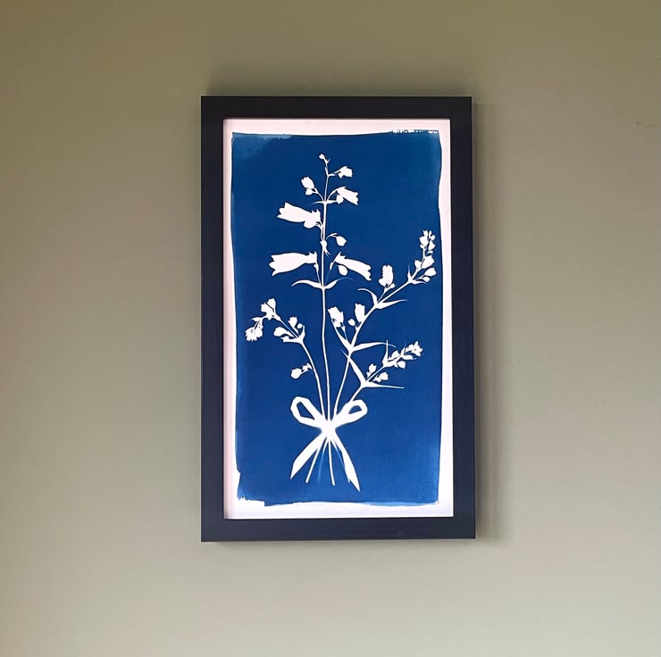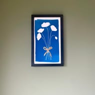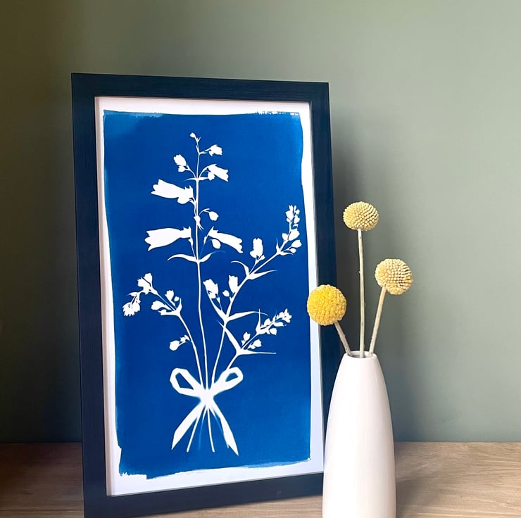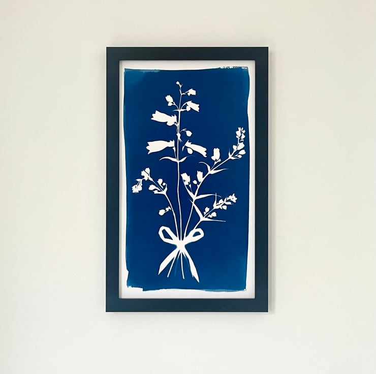 An original cyanotype print illustrating the beauty and elegance of the Penstemon flower stems, tied with a simple bow. This is a striking blue print that commands attention. It is an everlasting bunch of flowers - a perfect gift to others or oneself!