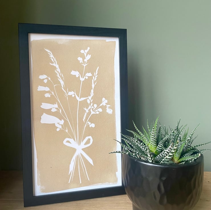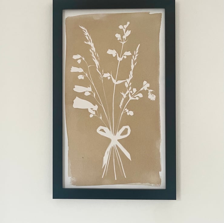 This cyanotype is bleached and dyed in a green tea solution to produce the soft brown hues that compliment neutral decor. Again, like the process of creating a cyanotype, the process of dying a cyanotype is completed fully by hand and so tones and colours vary. The slight unpredictability of the technique adds to its appeal to me as each print is truly original.