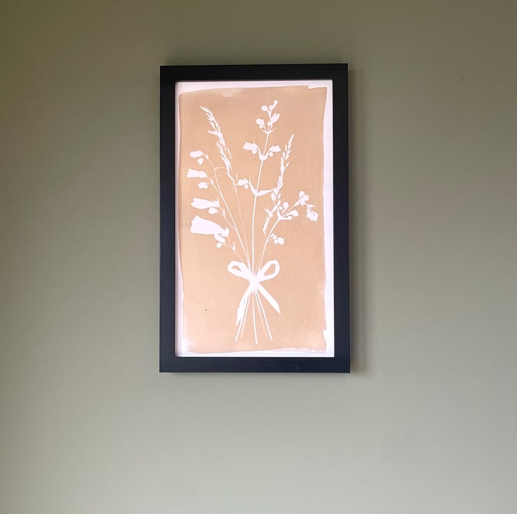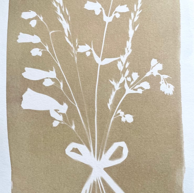 An original cyanotype showing the detail and beauty of Penstemon flowers contrasted to elegant grasses and tied with a simple bow. This beauty of nature is here to be enjoyed and valued as an everlasting bouquet.