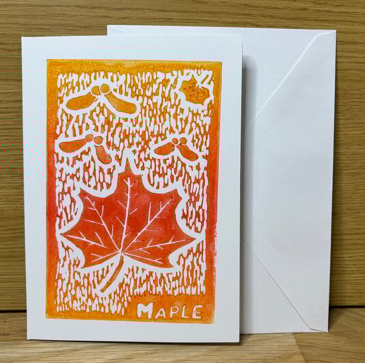 This card features a hand-print in an orange to red gradient of my original lino cut design of European maple leaf and seed pods.