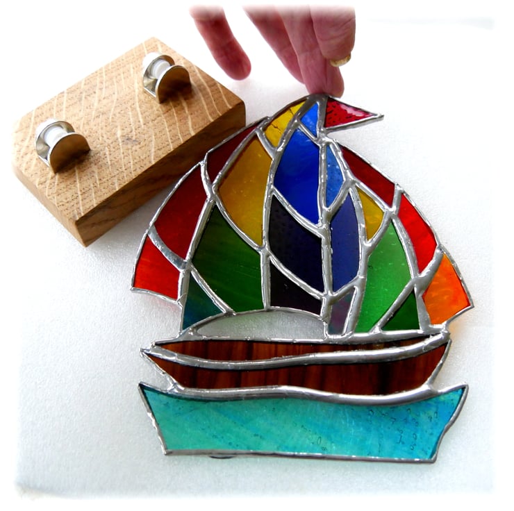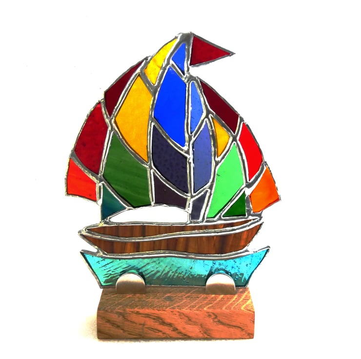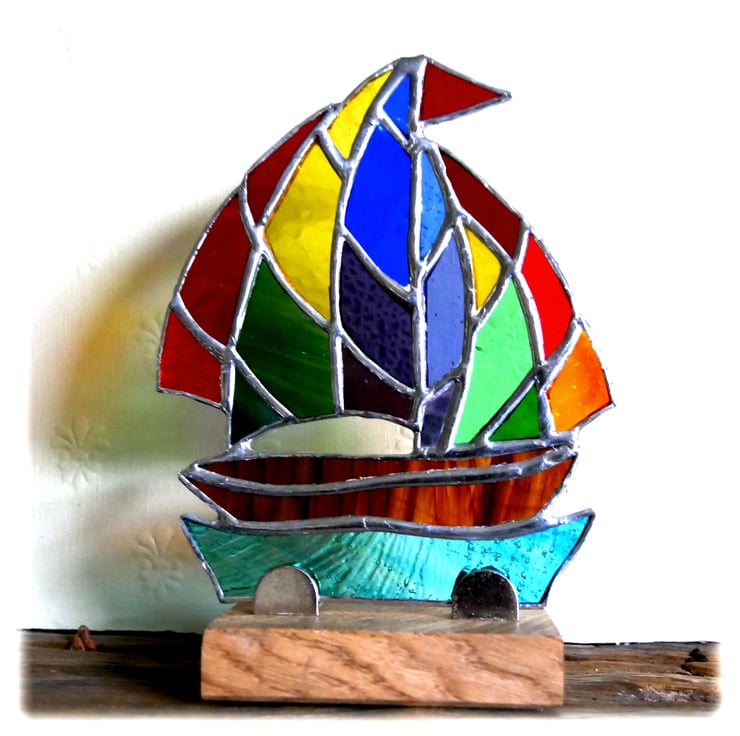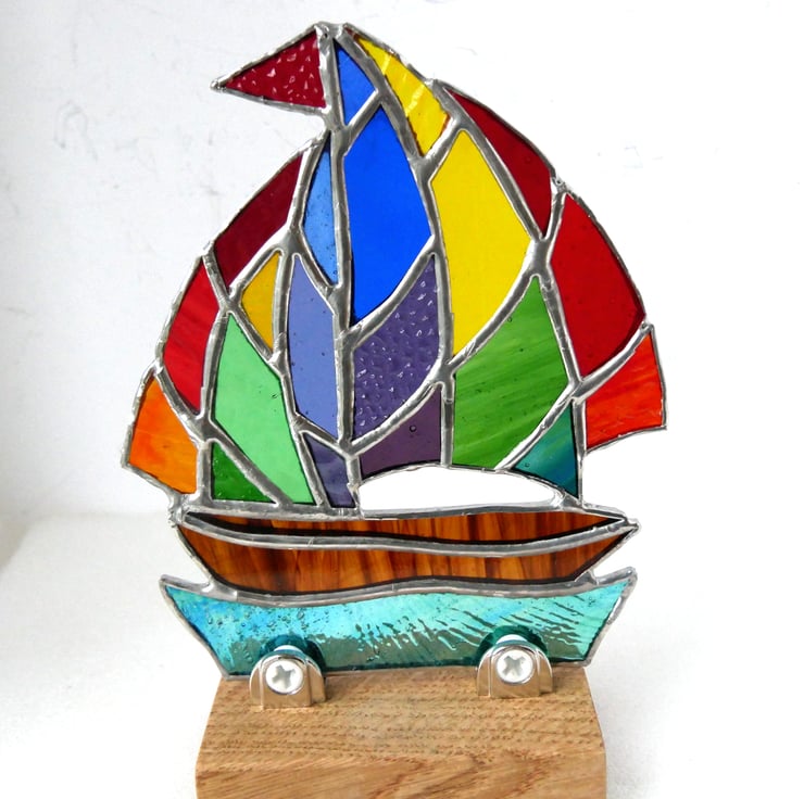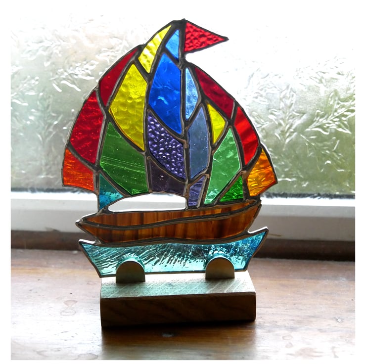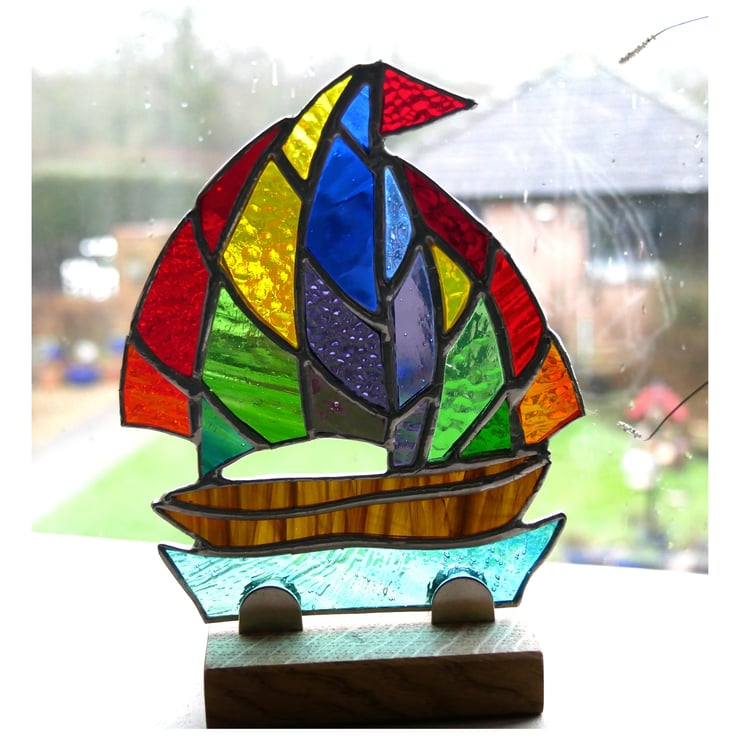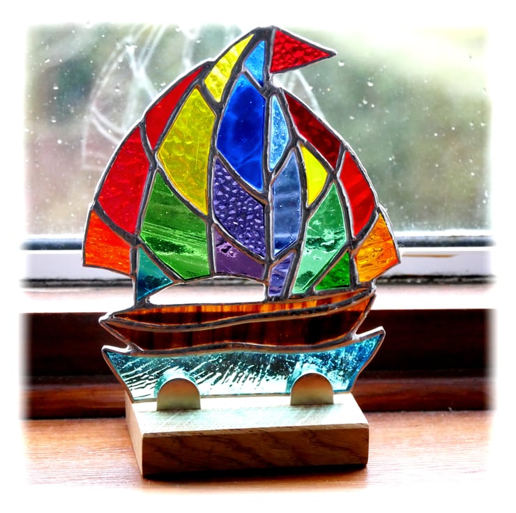 The sail is cut from a mix of rainbow coloured glass, each piece different. It has a bright red flag. The boat is streaky brown and the sea a textured, wavy teal colour.