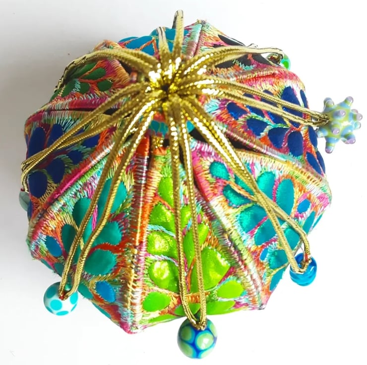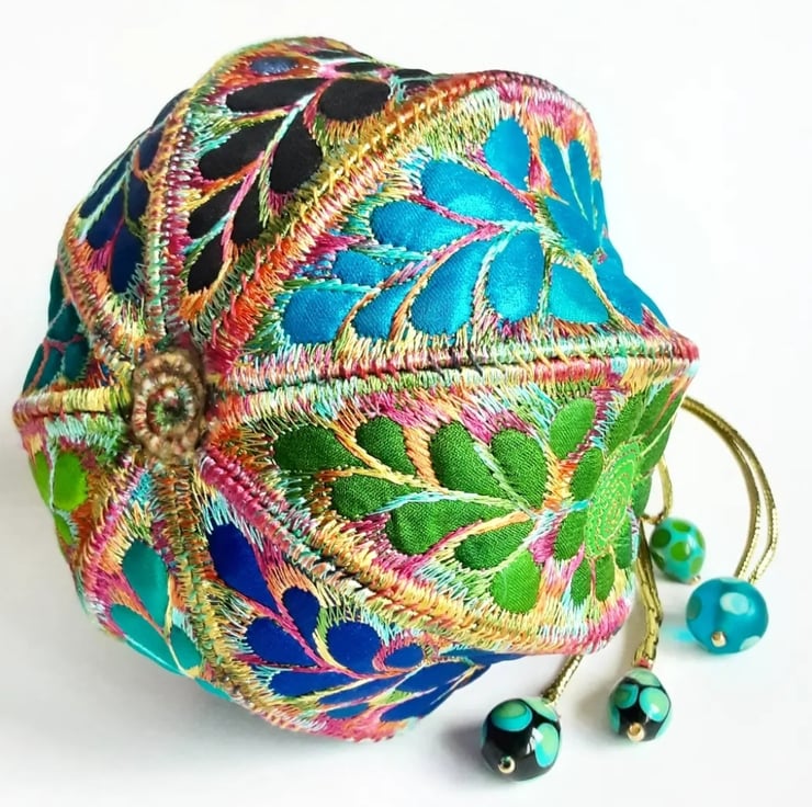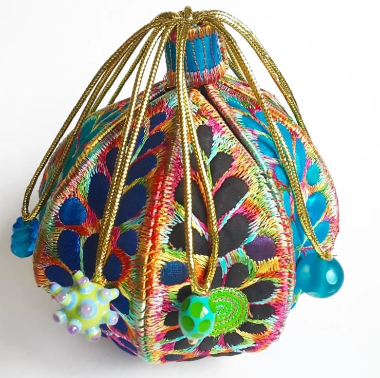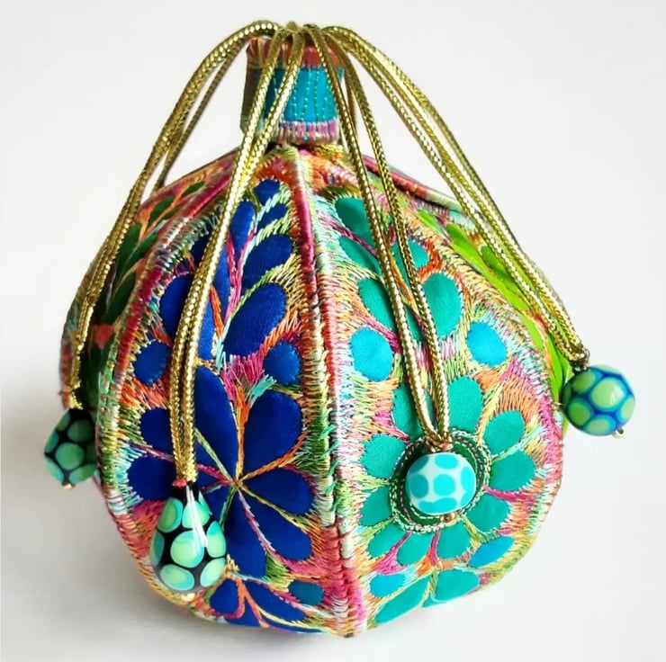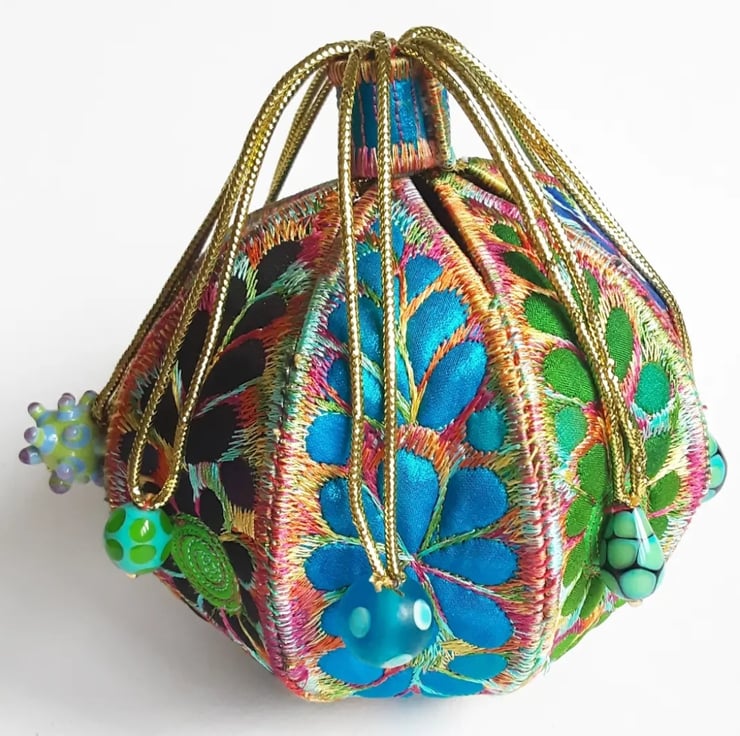 There is a coil of fabric to keep it closed and one of my own handmade glass beads hanging off the thread of each loop.