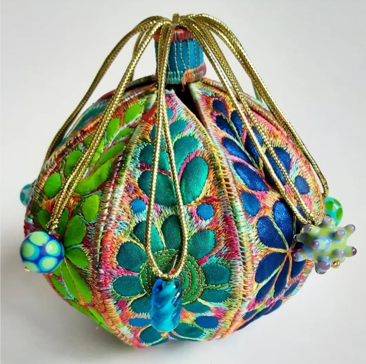 Made from layers of fabric including hand dyed Egyptian cotton and silk fabrics using the free machine embroidery style of sewing and applique.