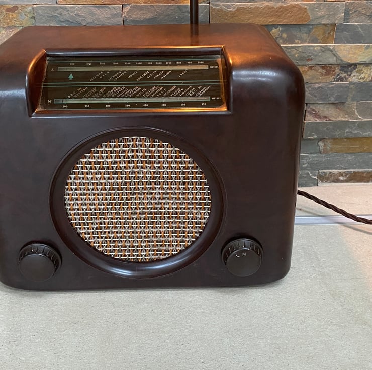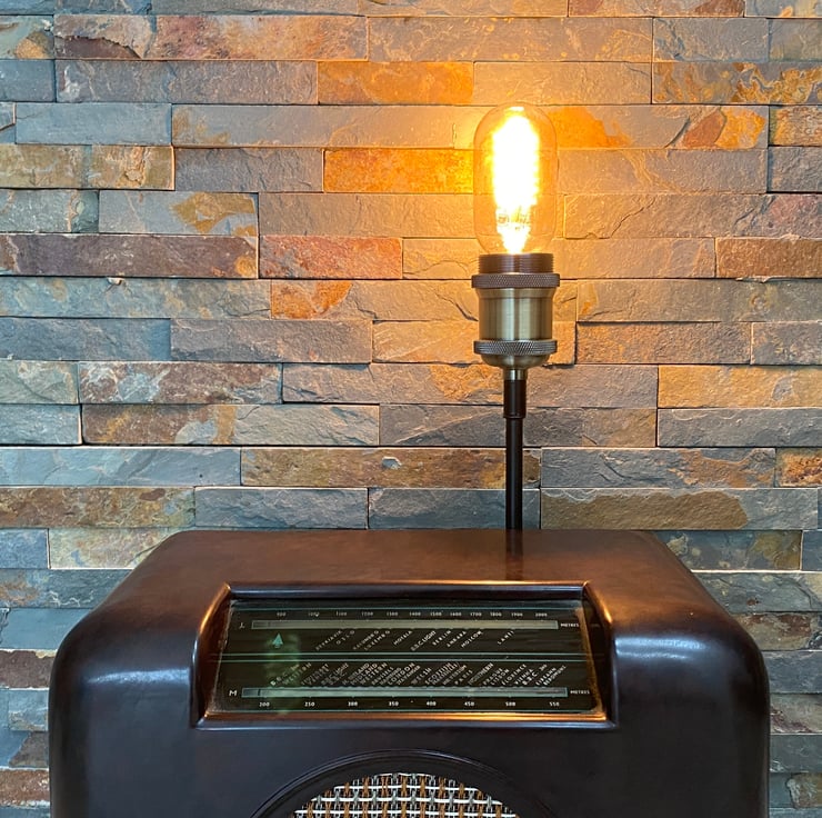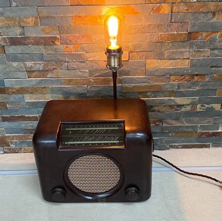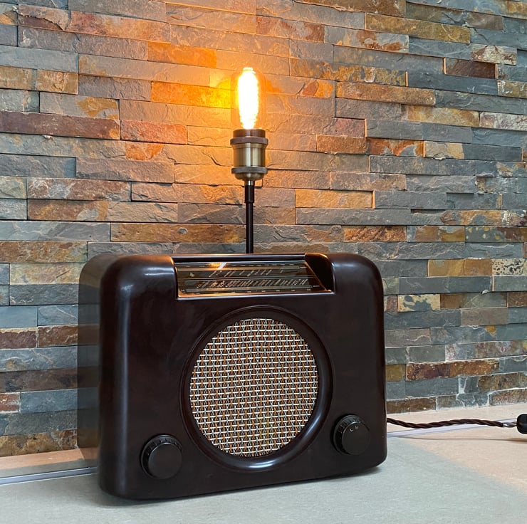 This is my original 1940s Bush Bakelite radio. Had in my collection for 30 years and in excellent condition . Cant find the original plug though they are easily obtained . Up cycled to this beautiful desk lamp without ruining the original item . Discreetly and neatly wired at the back with new period correct twist braided cable (approx 2M ) inline switch and bakelite style plug (3A) . Lamp extension with vintage style brass effect bulb holder with Edison E27 leg screw fitting (bulb not included) the choice is vast. Superb talking piece lamp. Just as an idea I have another that I have done and I stand a smart speaker behind and play music etc thru that . the effect is great.