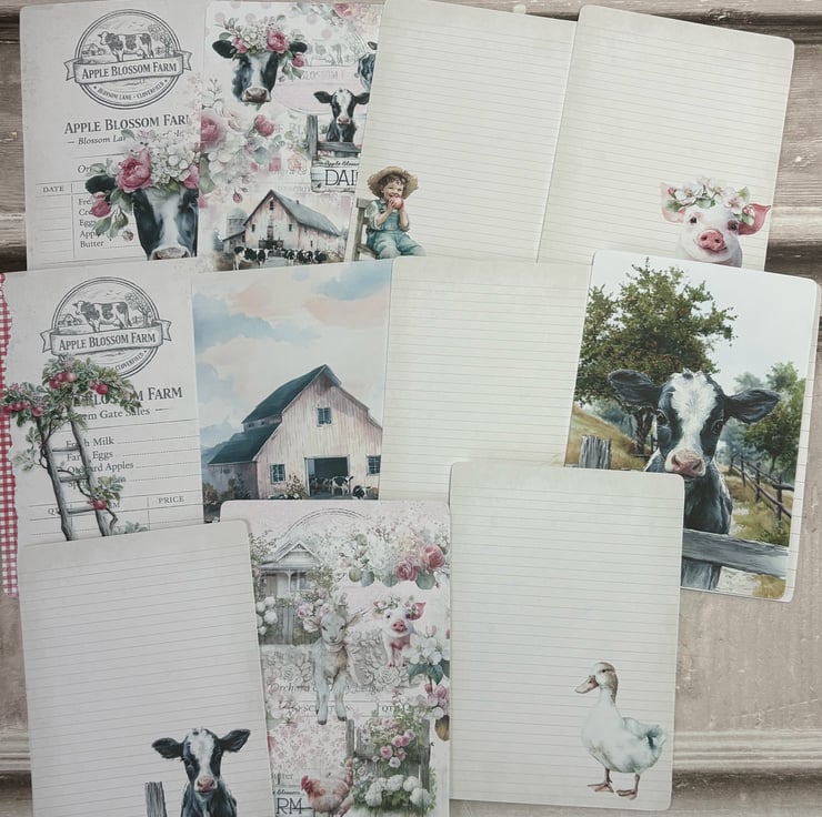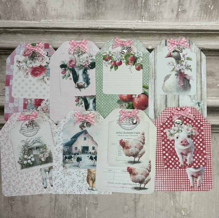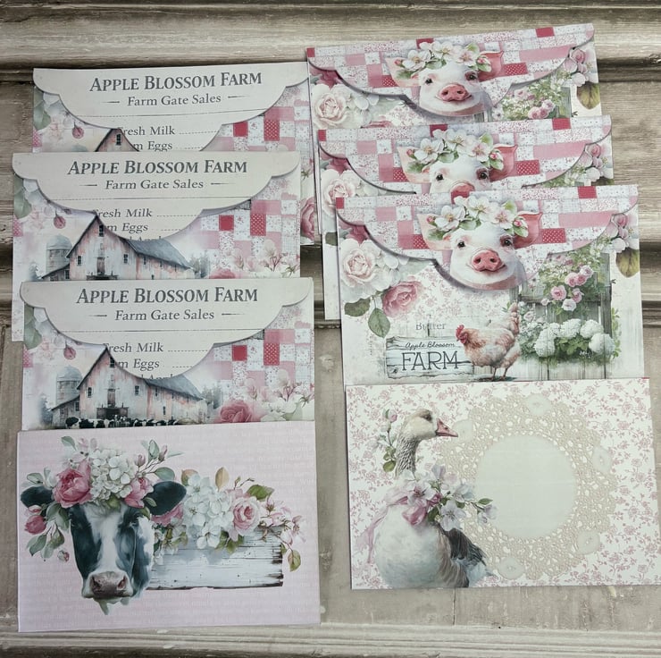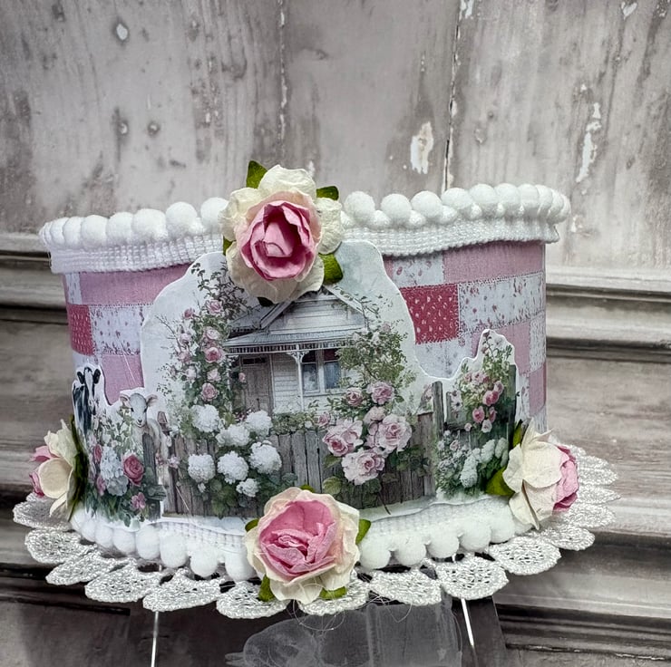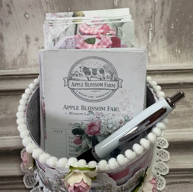 Desk Caddy made from sturdy greybeard, covered in a patchwork paper design, 3D image of farmhouse, fences and flowers with a cute calf and lamb popping over the top. Mini pom poms to the top and bottom edge, doily added to the bottom with roses to decorate. The caddy holds 16 journalling or cards to add reminders, 8 double tags with gingham ribbon and a farm charm. 8 handy mini envelopes to add receipts of use to sen one of the tags or journalling cards with a message. A pretty lamb decorated pen added to the caddy.
