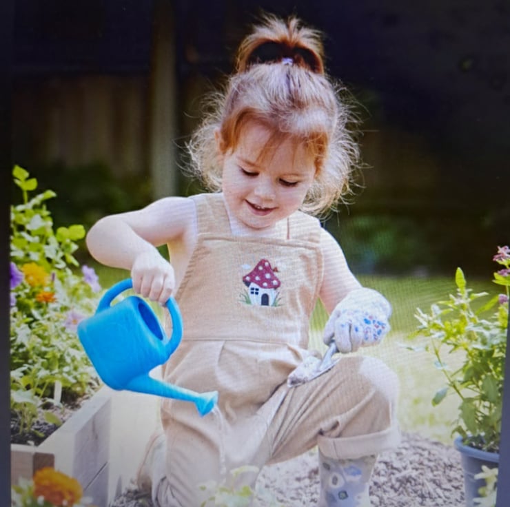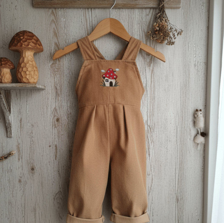 Super soft needle cord dungarees with fairy toad stool house on bib. Rolled up legs for extra growing room. Great fun to wear.