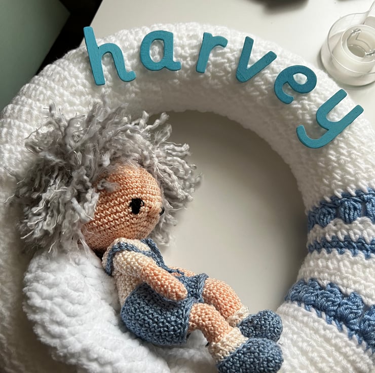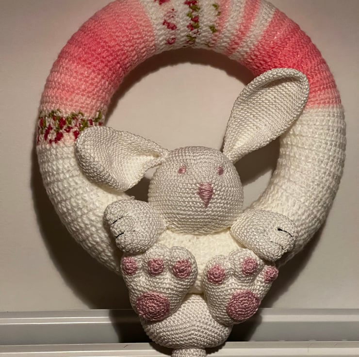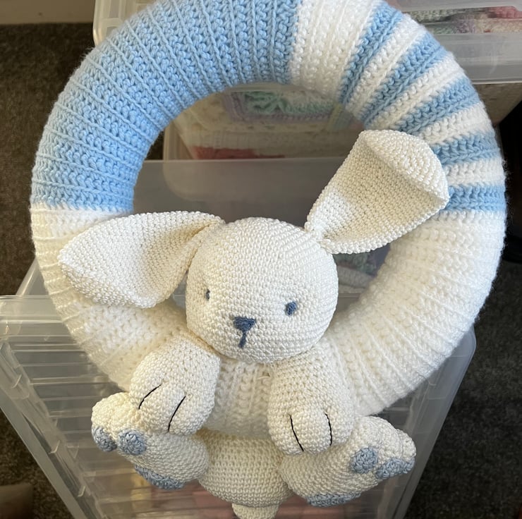 30mm diameter wreaths made to order with cute bunny displayed in the middle. Add the Childs name in painted wooden letters.