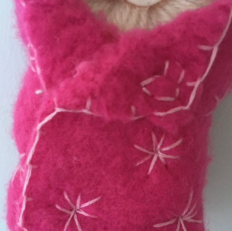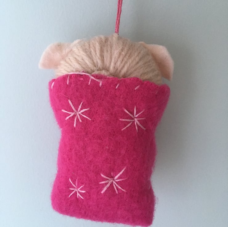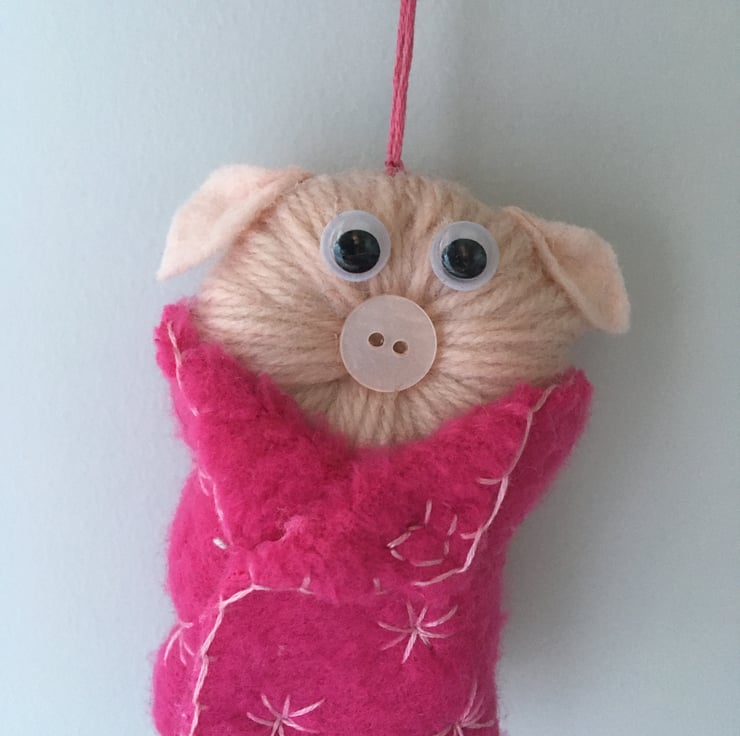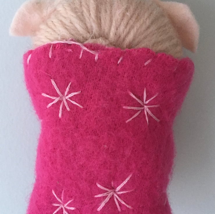 They are made by wrapping wool around curtain rings foraged from charity shops. A pink button is used as the pigs nose. Googly eyes are added and little felt ears. Each pig is wrapped in a fleece blanket, which is them embellished with hand embroidery.