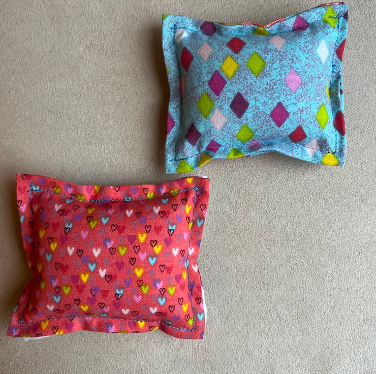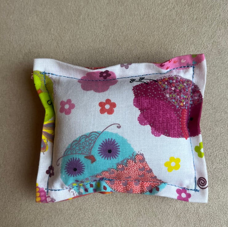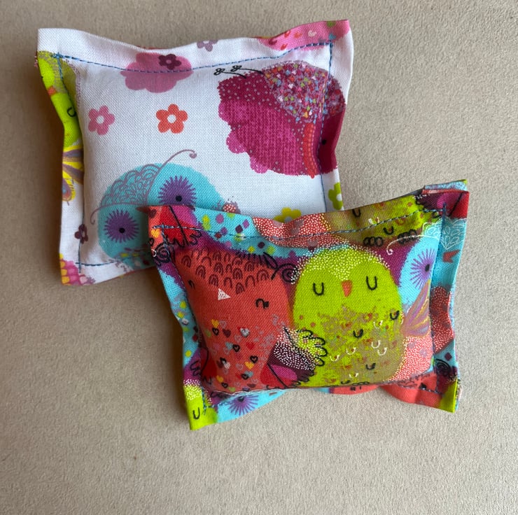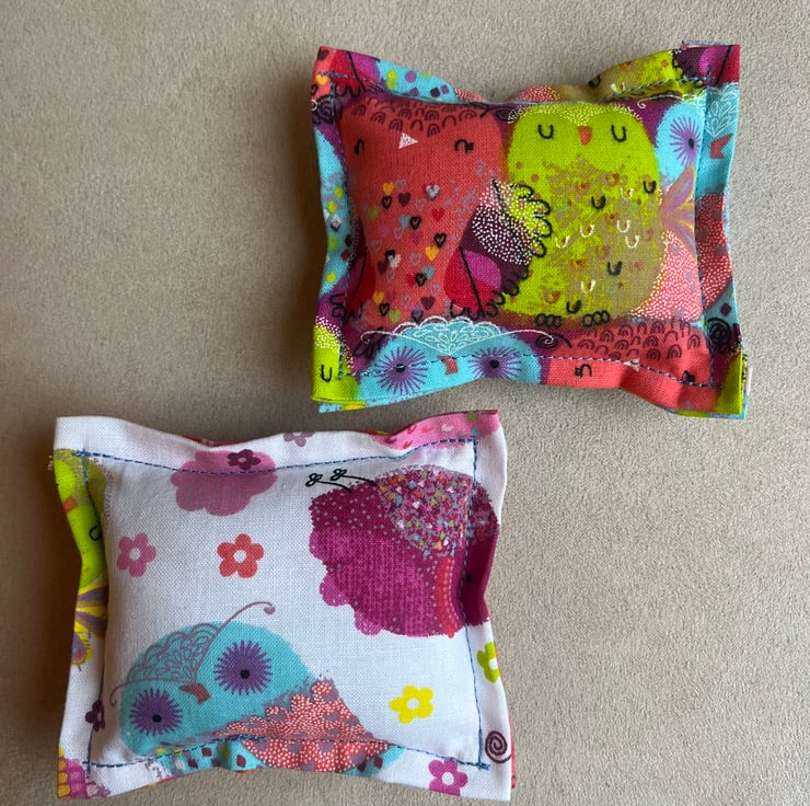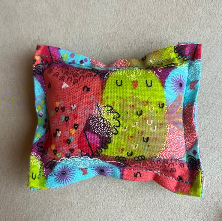 Each cushion is rectangular in shape and measures approximately 9cm x 11cm, making them a lovely compact size for a sewing table, craft bag, or studio space. The bright colours and owl design add a cheerful touch to any creative corner. Exposed blue stitching for a truly handmade feel.