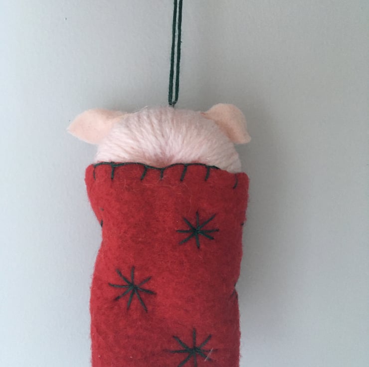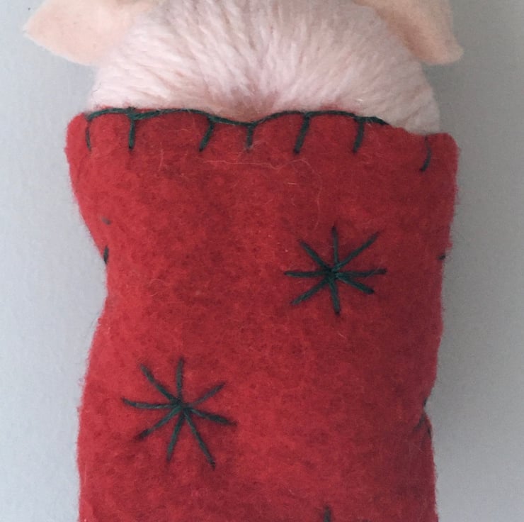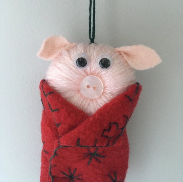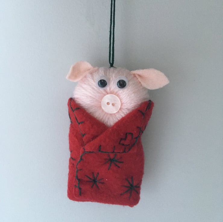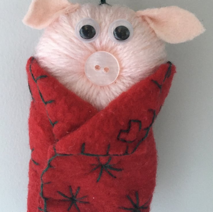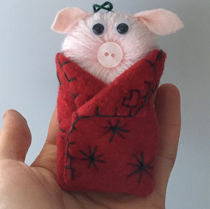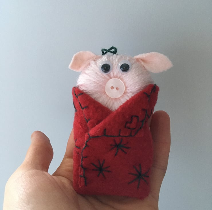 They are made by wrapping wool around curtain rings foraged from charity shops. A pink button is used as the pigs nose. Googly eyes are added and little felt ears. Each pig is wrapped in a fleece blanket, which is them embellished with hand embroidery.