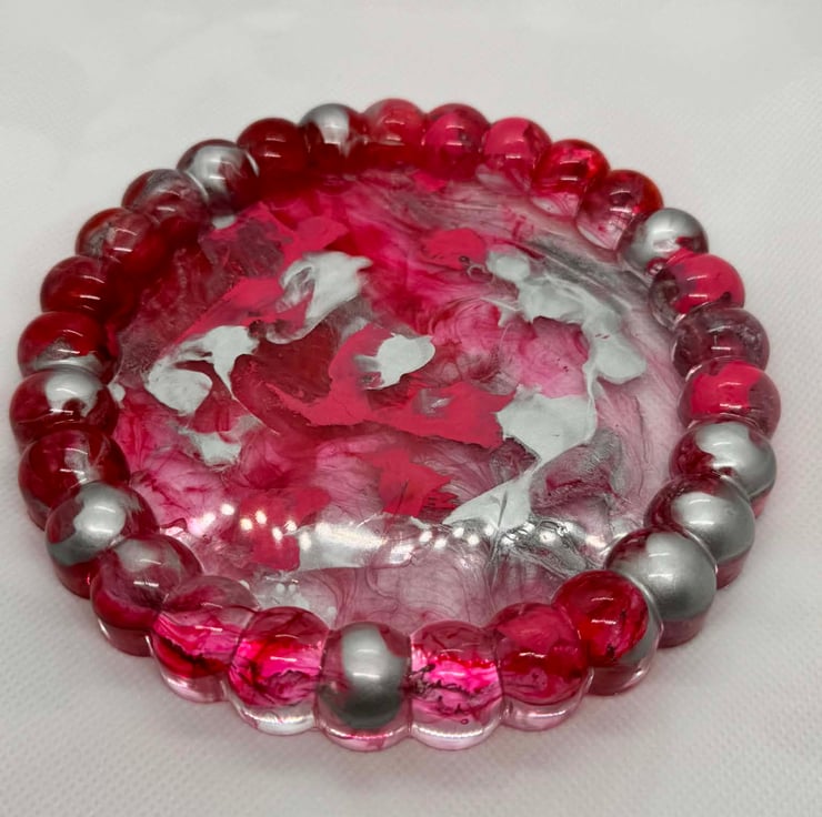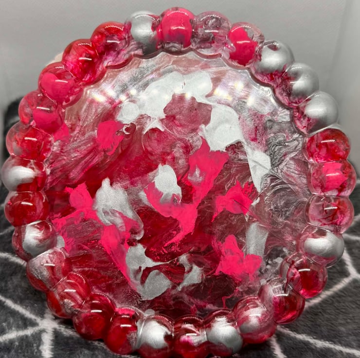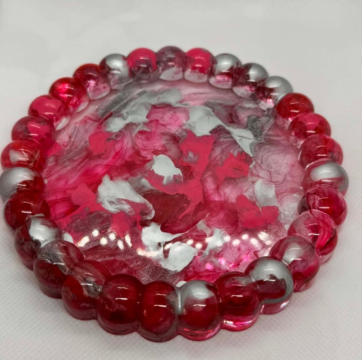 Add a bold touch of elegance to your space with this handcrafted Crimson Marble Trinket Dish. Made from glossy resin, this piece features rich ruby-red tones swirled with soft blush, white, and smoky silver accents—each pattern flowing naturally for a one-of-a-kind finish. The scalloped edge adds a delicate, decorative detail that catches the light beautifully.