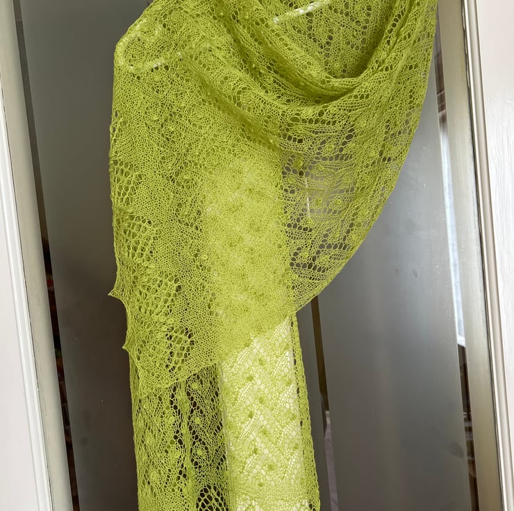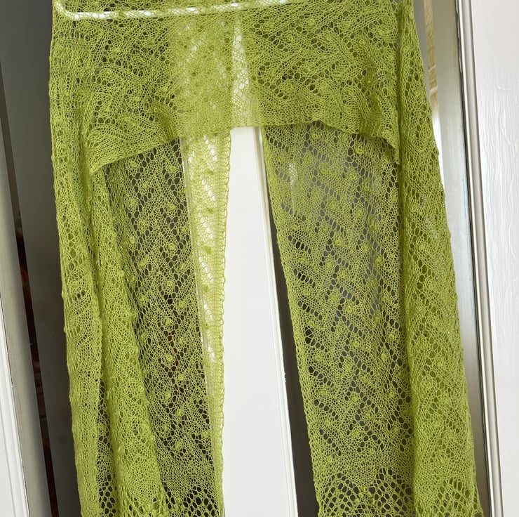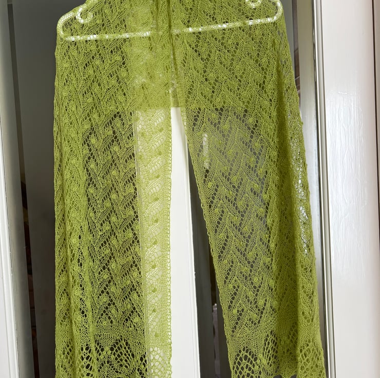 This handmade knitted shawl is a stunning piece crafted by me from merino wool in a beautiful lime colour .