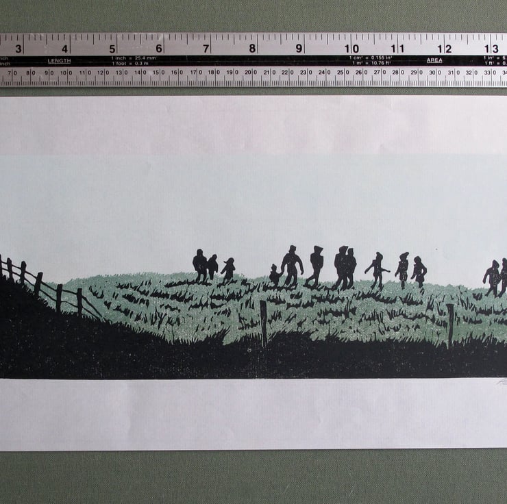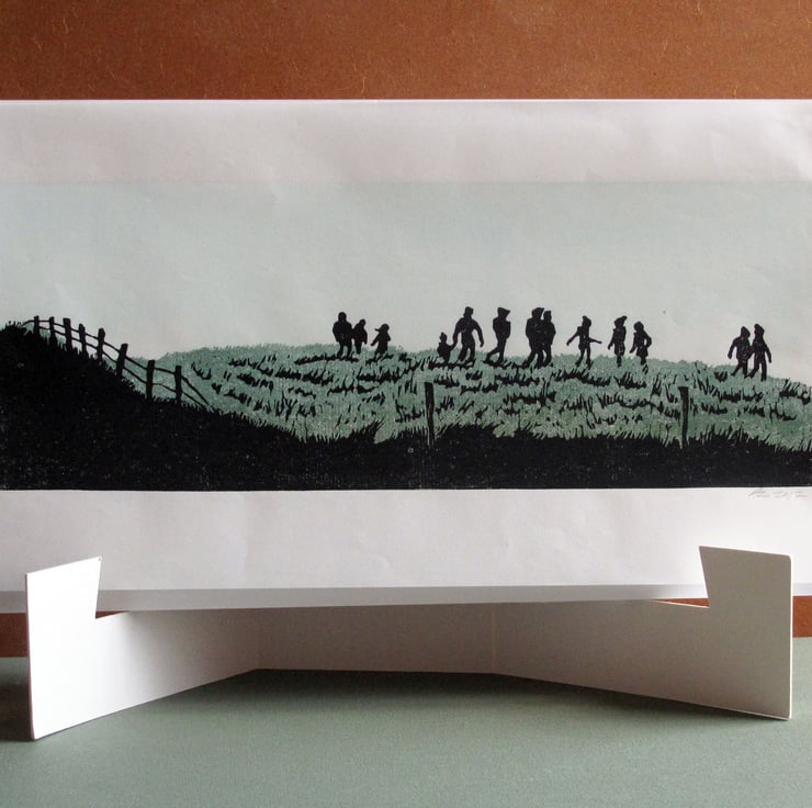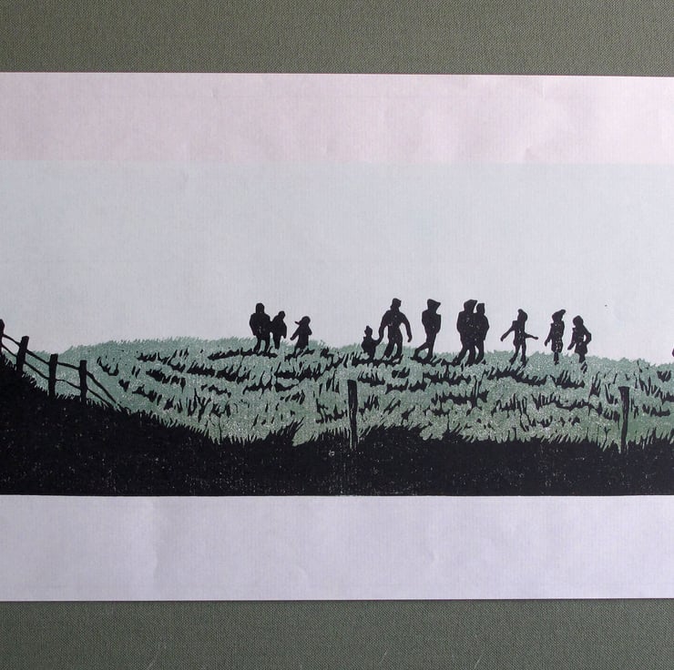 A friend and I did an exhibition about Tegg’s Nose Country Park, near us. This image is inspired by a walk I did in the freezing cold one day when I saw a couple of families walking over the hill above me silhouetted against the winter sky. They were all wrapped up warm against the chill.