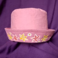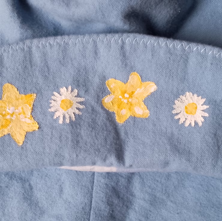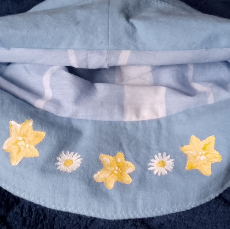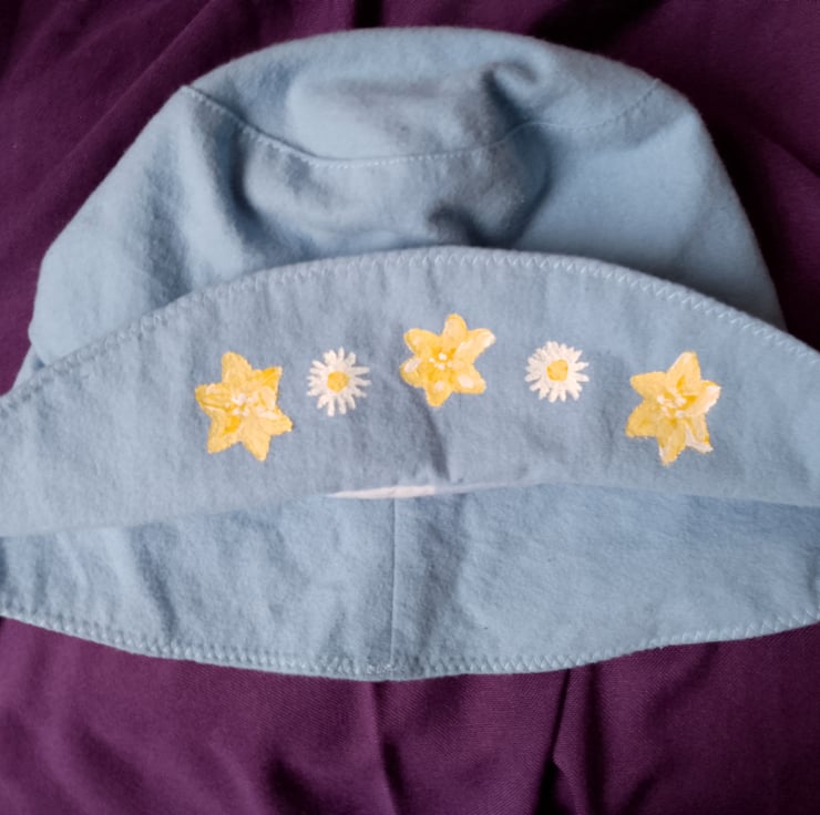 Hat for teens, powder blue with yellow painted flowers.
