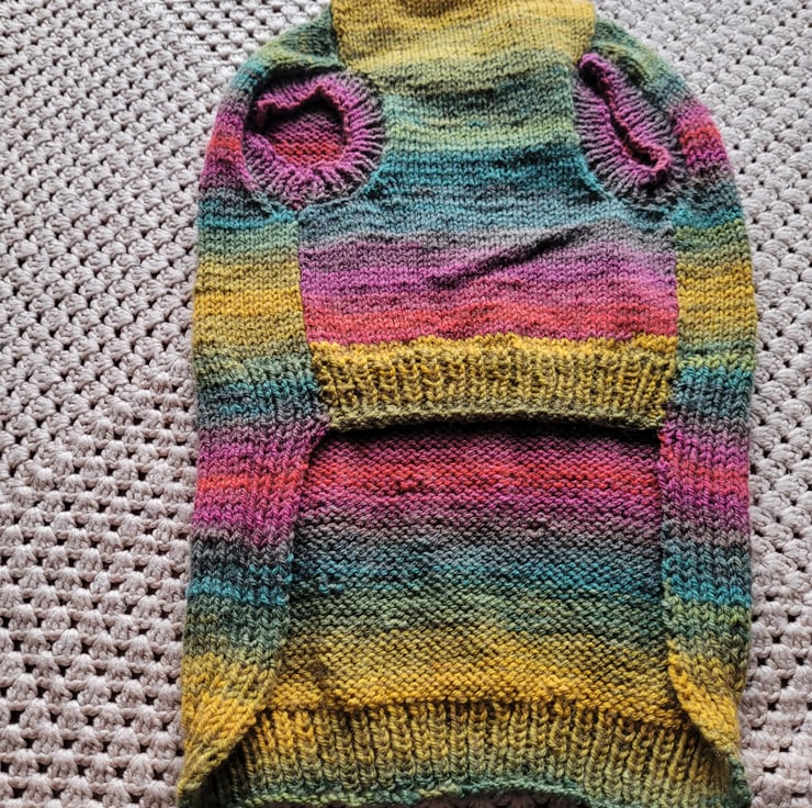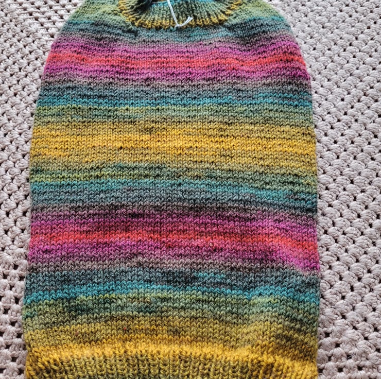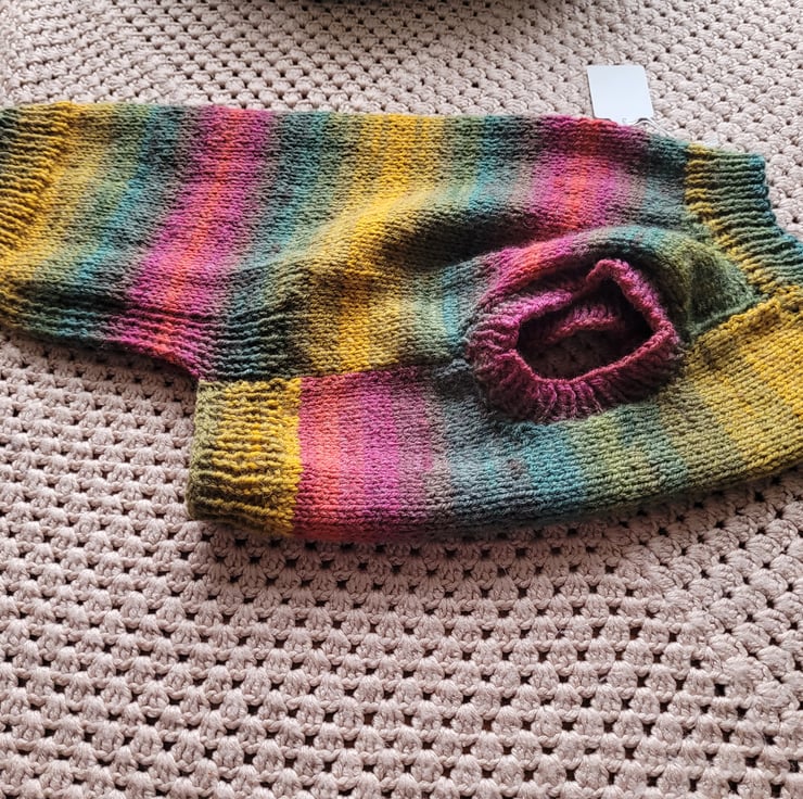 Crew neck. Doggy jumper. Hand knitted in rainbow yarn. Size S/M. Length 16 inches. Chest 22 inches. Suitable for male or female dogs with a broad chest. Machine washable on low settings.