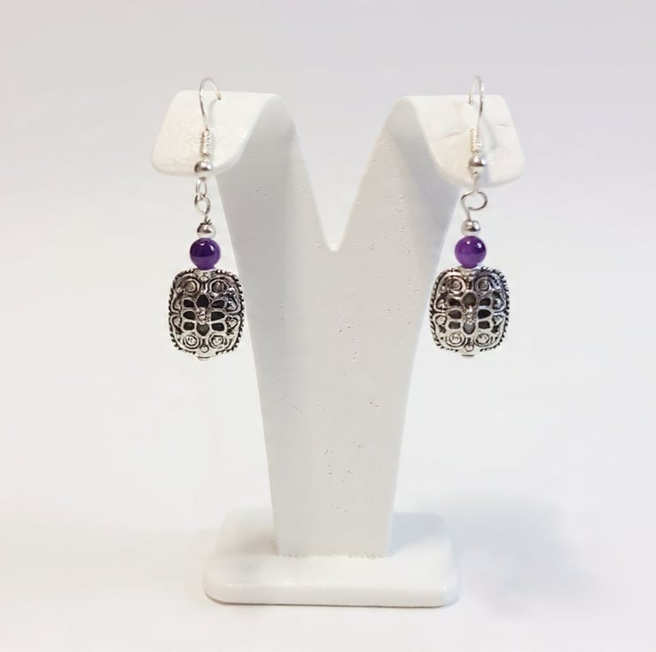 These elegant filigree Tibetan Silver earrings feature Sterling Silver hooks and delicate 2mm Sterling Silver beads. A stunning 3mm Amethyst gemstone bead adds a touch of sophistication and chic style.