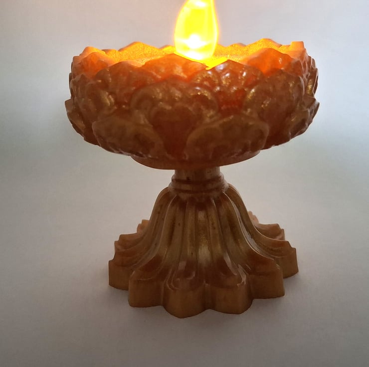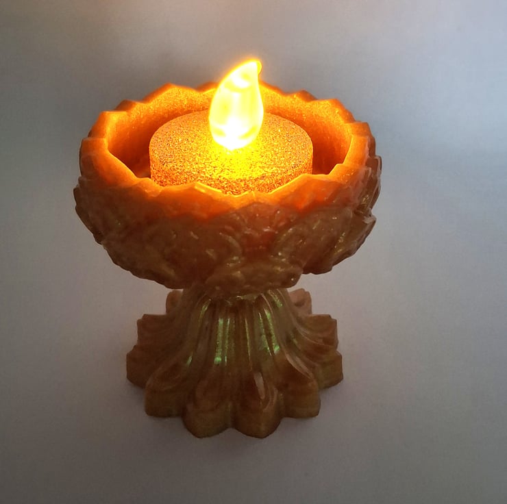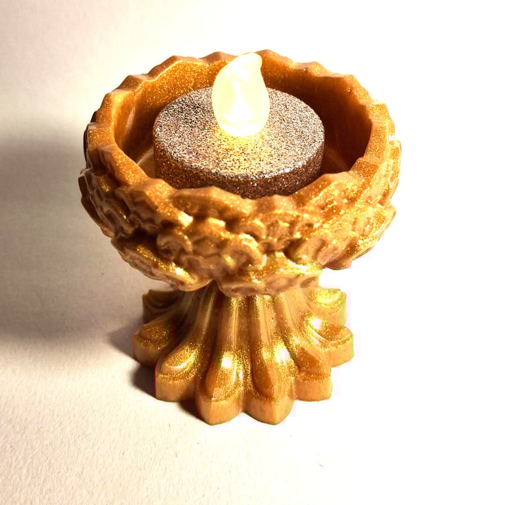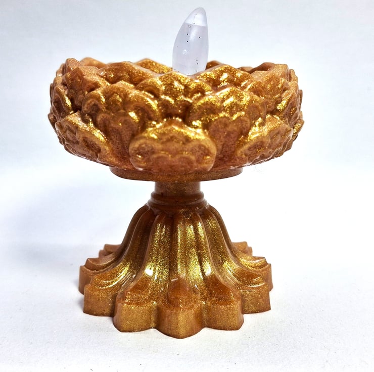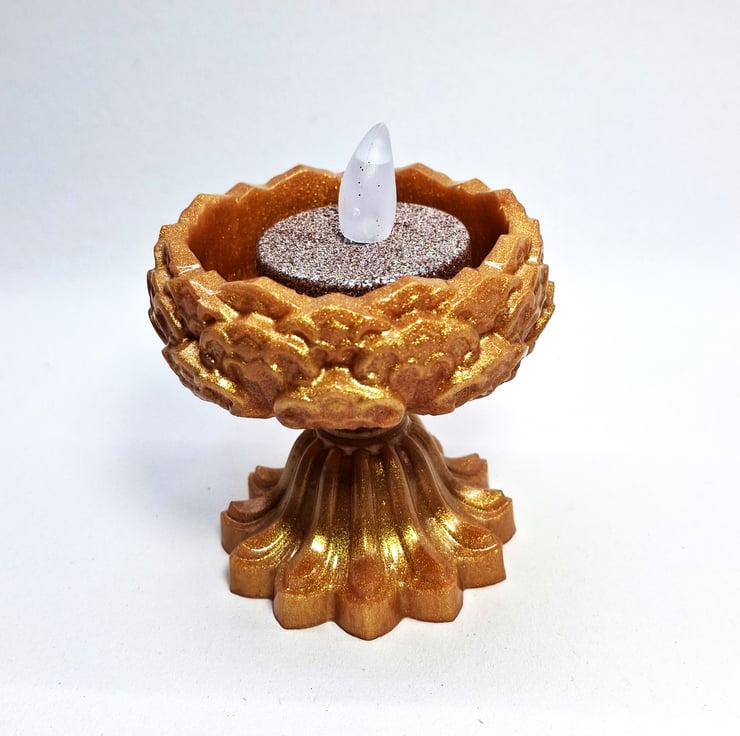 The top is flower petals overlapped to create the bowl, The base is a lovely decorated plinth.