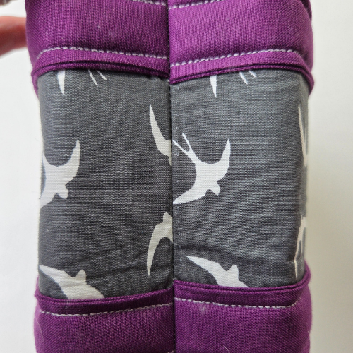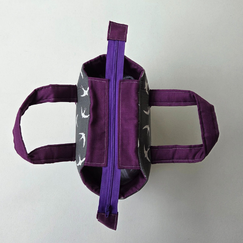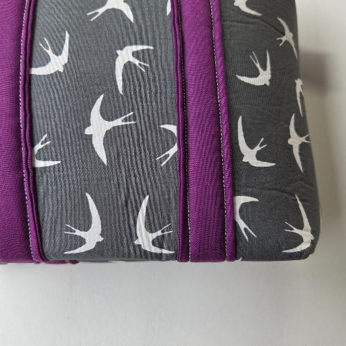 Exterior cotton fabric is grey with swift bird silhouettes in white printed on the grey fabric. Interior is made from plain purple cotton fabric and is one compartment, there are no interior pockets. The same plain purple cotton fabric makes up half the top of the tote and houses a zip which closes the top of the tote. Plain purple cotton fabric handles each side of the bag have fleece lining to give a soft feel.