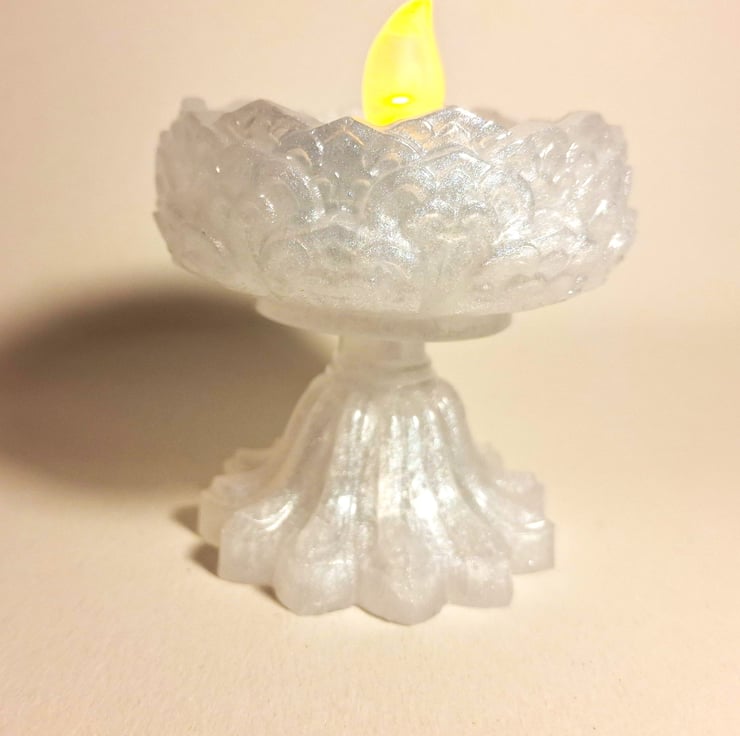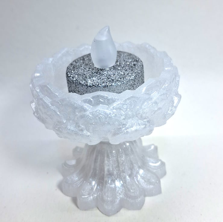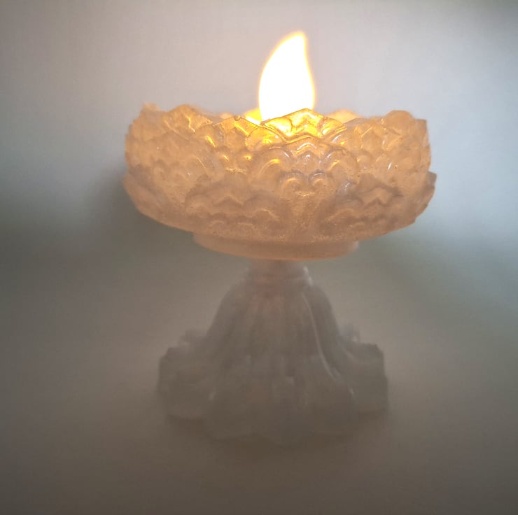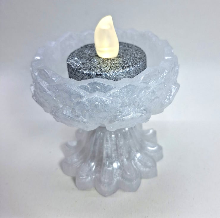 This lovely piece stands 7cm tall, 5.5cm candle area, 6.5cm across the base.