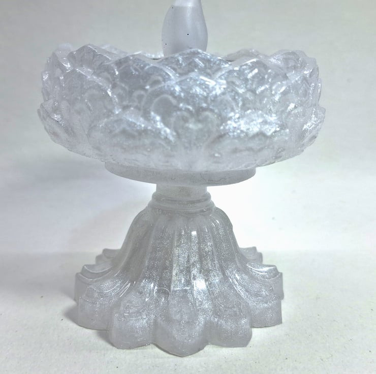 The top is flower petals overlapped to create the bowl, The base is a lovely decorated plinth.