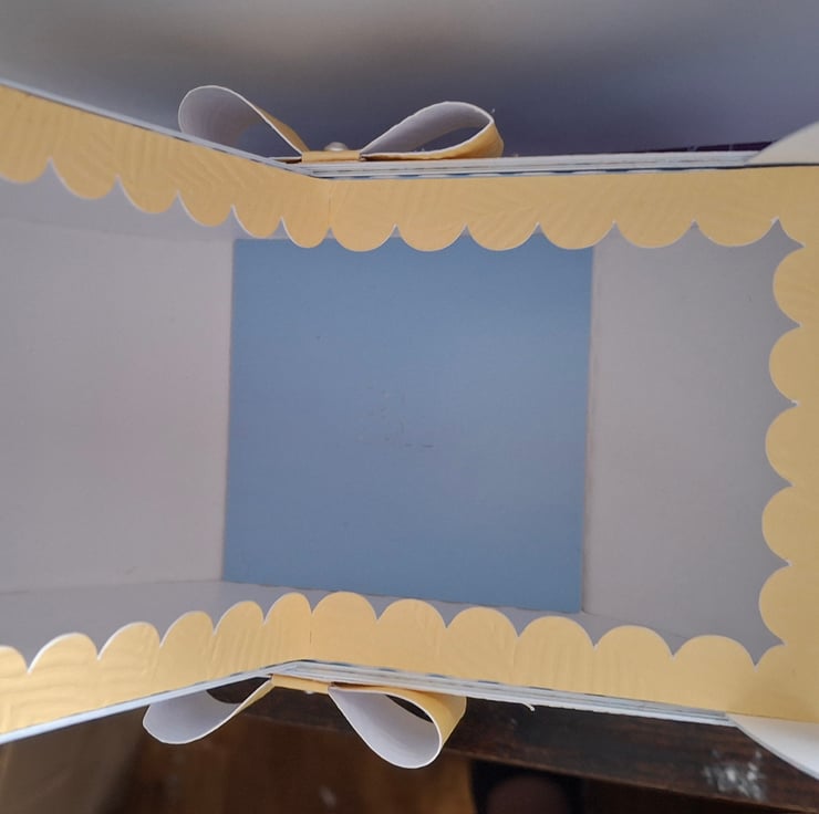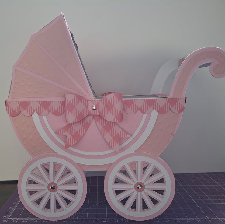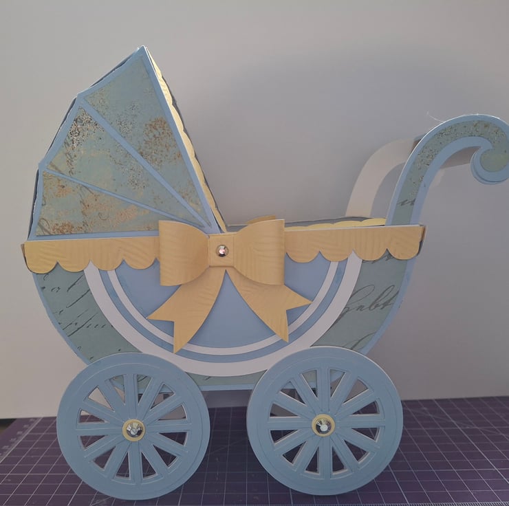 Handmade from paper and card this keepsake gift box in the form of a baby carriage or pram can be filled with little gifts for the new arrival.or the new mother. It's sturdy construction means it will endure as a treasure for many years.