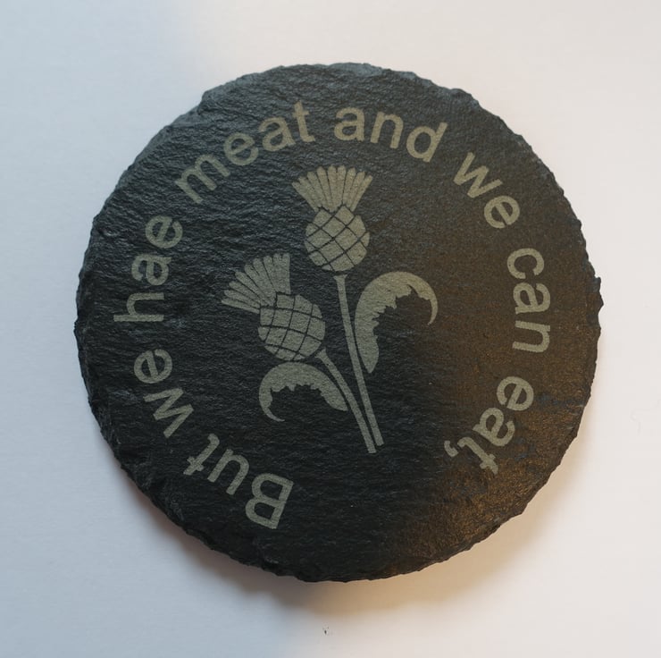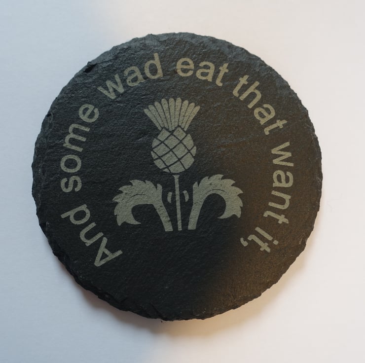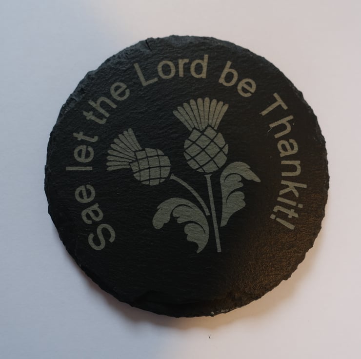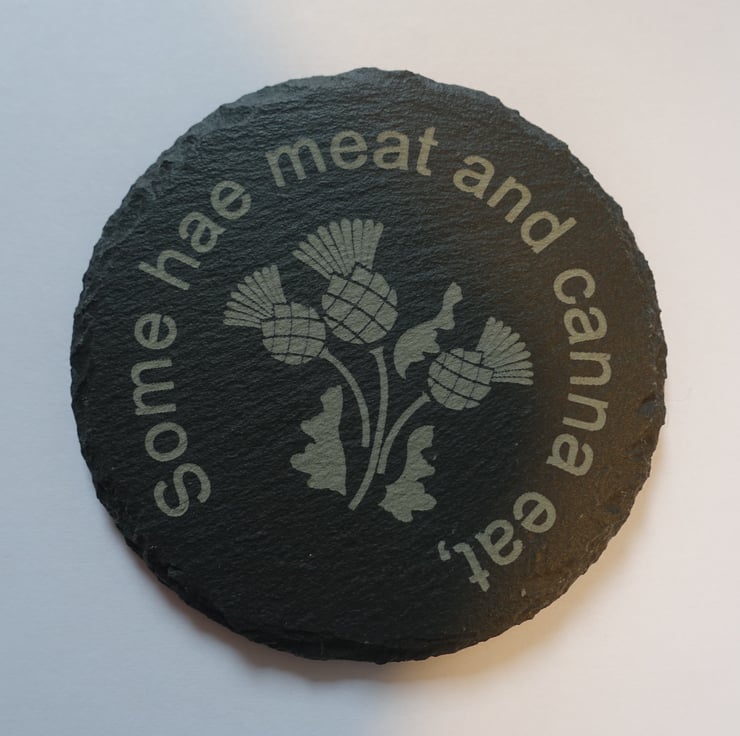 Set of 4 natural slate coasters with a thistle theme and the Selkirk grace. The Selkirk grace is often attributed to Robert Burns, but is likely to be older.