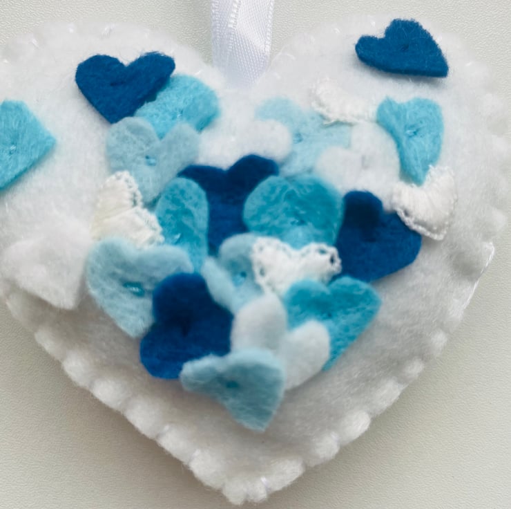 A white felt heart adorned with a scattering of pale blue, royal blue, turquoise, white and vintage lace hearts. Approximately 7.5cm in length and 9cm across. It has a white satin ribbon hanging loop and a button detail on the back. Lightly filled with toy stuffing, this creation is for decorative purposes only.