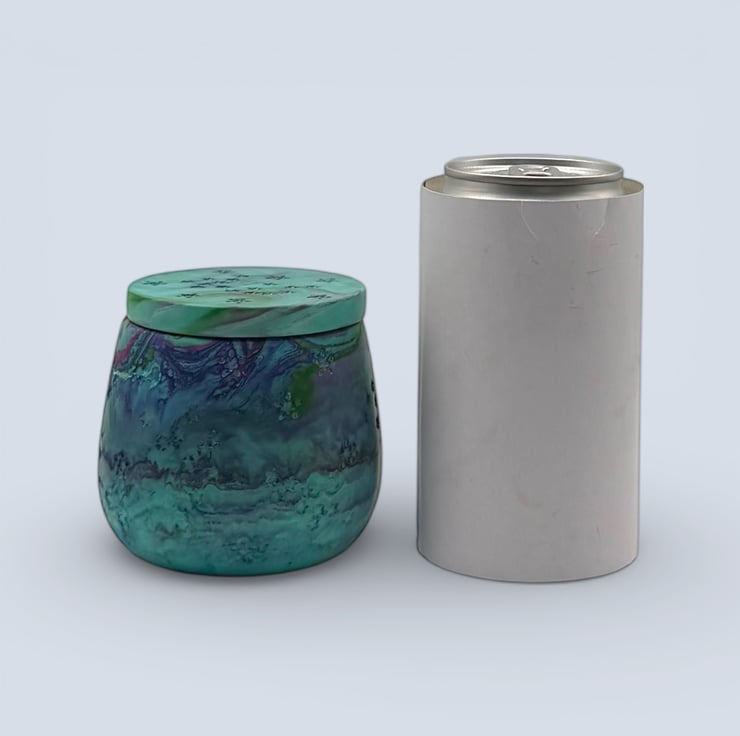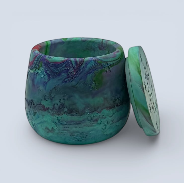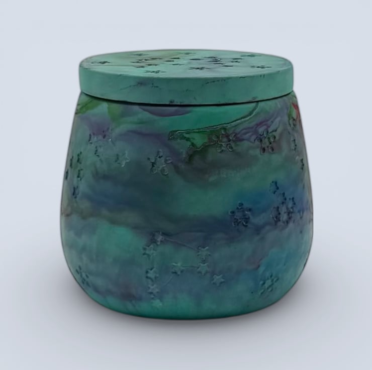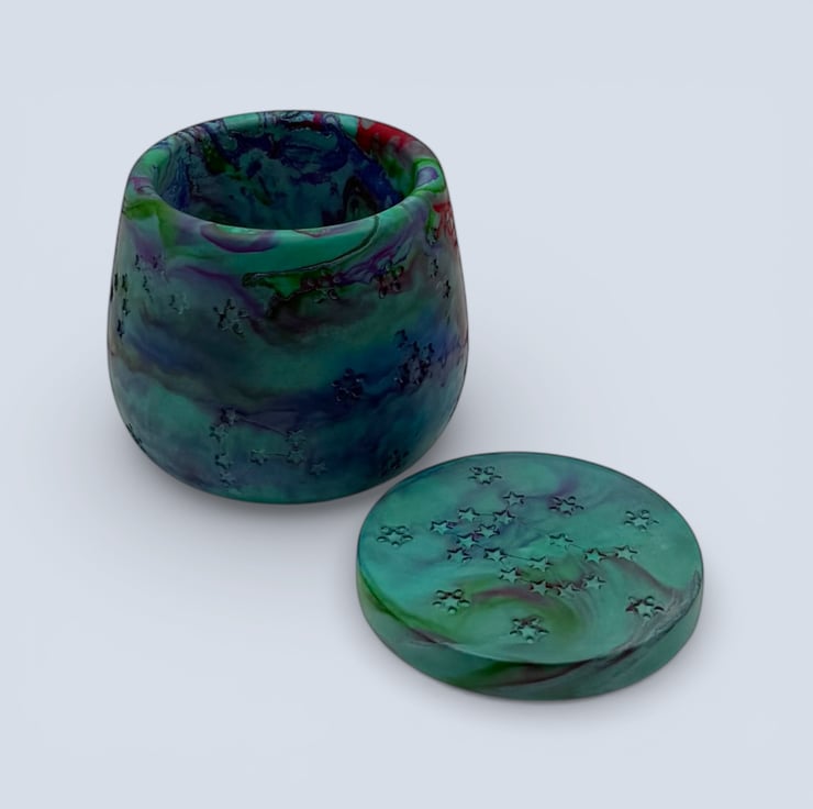 Aurora Borealis jewellery box in green, teal blue and purple marbling, with a fitted lid decorated with stars and constellation details. The marbled colours swirl around the pot with hints of deeper blue and a touch of brighter accent colour, making this a one of a kind keepsake pot for rings, earrings and small treasures.