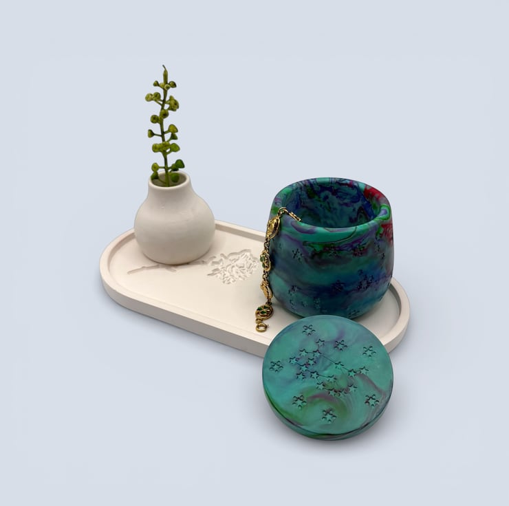 Inspired by the shifting colours of the Aurora Borealis, this jewellery box reflects the way light moves across the night sky. The layered marbling mirrors drifting bands of colour, while the star and constellation details add a subtle celestial finish, making each piece feel quietly magical and completely unique.