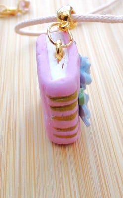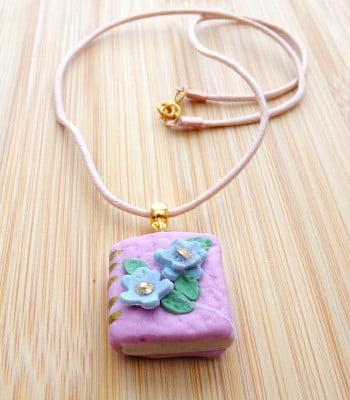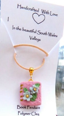 A quirky fun pendant for book lovers everywhere ! I have handcrafted this pendant in a shade of pale pink and decorated it with pale blue flowers with a crystal centre.