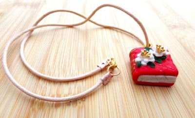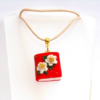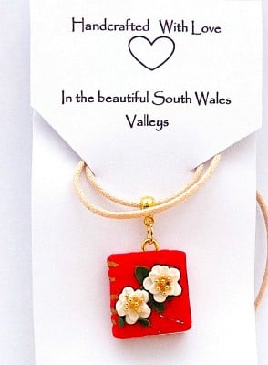A quirky fun pendant for book lovers everywhere ! I have handcrafted this pendant from polymer clay in a vibrant shade of red and decorated the front with white flowers and gold plated centres .