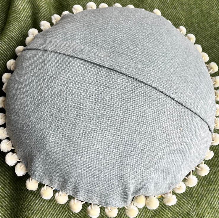The cushion is backed in thick linen in a soft blue-grey and it fastens with a concealed zip in the back.
