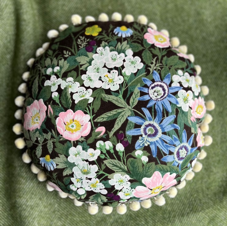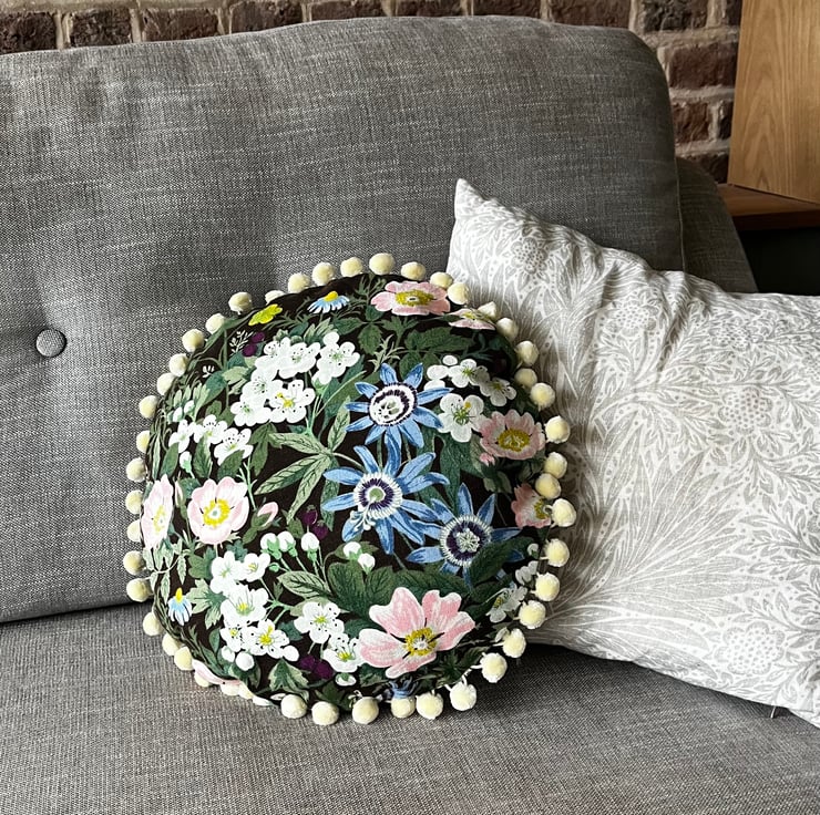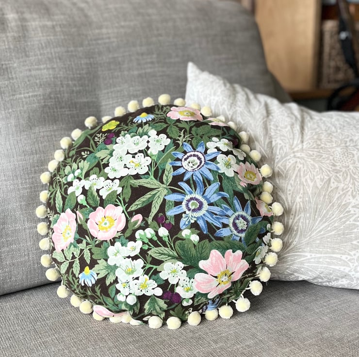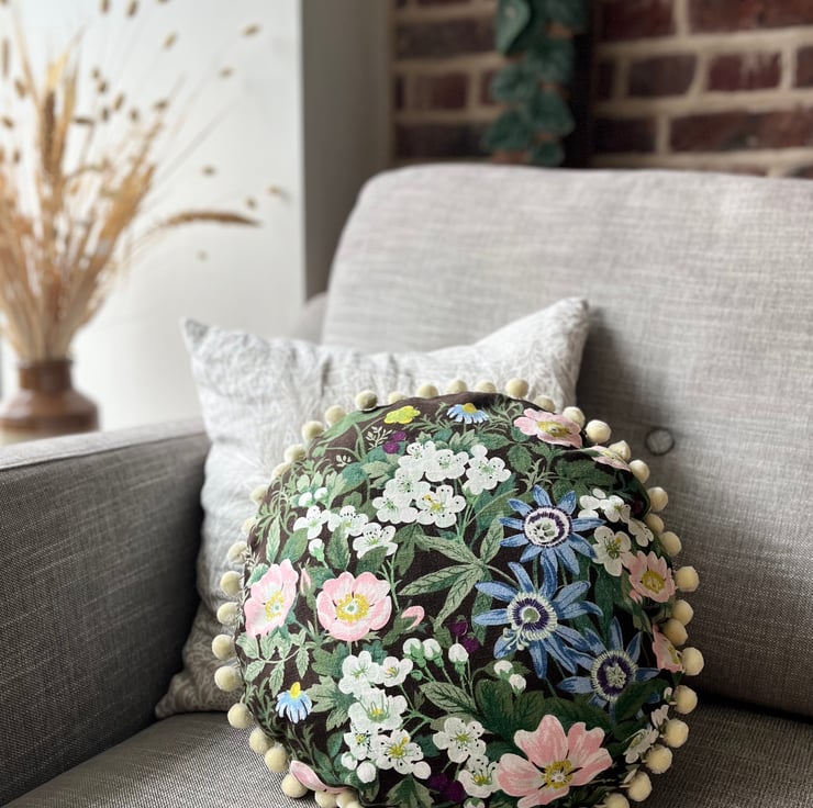 One of a kind feature cushion in vintage 1970s linen called Belinda by Jonelle. Beautiful dog roses daisies and passion flowers make a pretty bouquet against a dark brown background. The edge of the circular cushion is trimmed with velvety cream pompoms.