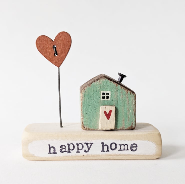 A hand stamped wooden base with a teeny painted house and a jolly button on a wire to stand beside it.