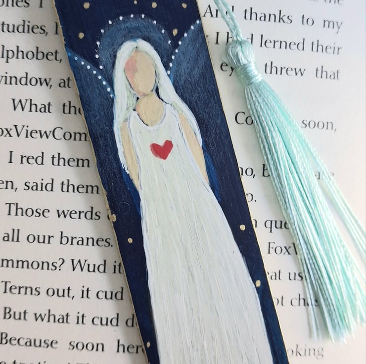 Completely hand painted wooden bookmark with acrylics, the image is of a folk art angel.